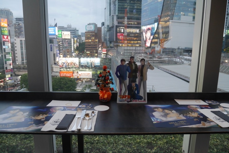 カフェ的な利用。いわゆるホテルのラウンジです。2022年5月現在、コナンの映画とコラボ中で、それをお目当てに行くと、店内にはいろいろと装飾が。装飾しつつ、本来のラウンジの雰囲気を損ねないよういいバランスを保っておりました。夕暮れどきの渋谷駅前の電飾や人の行き来を眺めることができ、雰囲気よかったです。