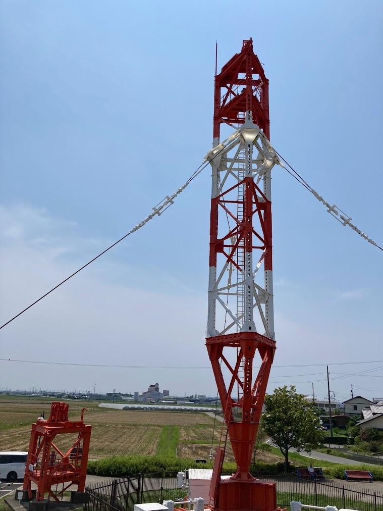 施設前にある1/10の高さで残された25mの記念鉄塔が遠くからも目立っています。