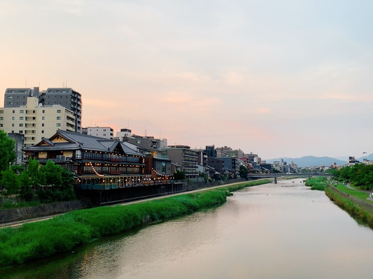 鴨川は川幅も広いので、どこも立派な橋が架かっていますが、晴れた日の夕暮れ時に橋から見る景色はすごくキレイなのでオススメです! 暖かい季節になると、夜は川床での飲食を楽しめるお店も増えてくるので、賑わうのも、京都らしくて良いと思います。
