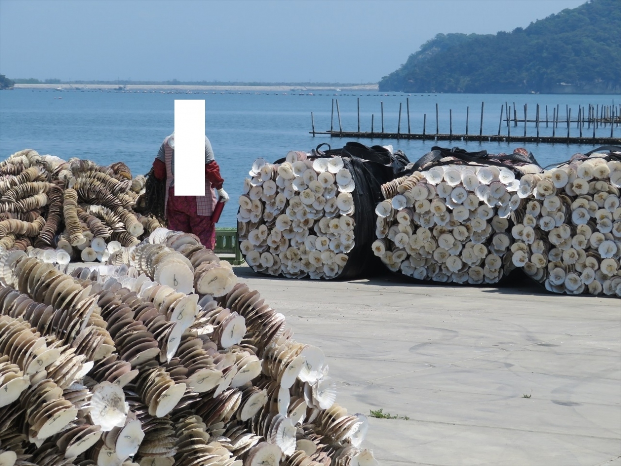 波穏やかな桟橋手前には海苔篊(のりしび:海苔養殖用に海中に立てる竹や木の枝)がびっしりあって、その合間の水路を進んで行く様子も見られます。
