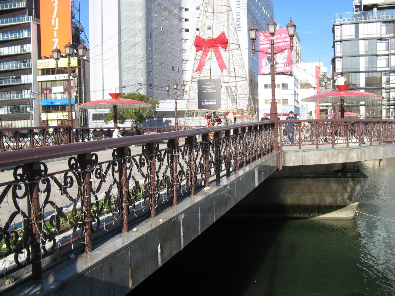 天神中央公園から中州へ渡る那珂川に架かる橋のひとつです。かって川を挟んで商人の町「博多」と武士の町「福岡」に分かれていた二つの町が、出会い繋がることへの想いで名付けられたとか。歩行者専用橋で中央には円形の広がった場所があり、ベンチなども設けられていて休息できるようになっています。