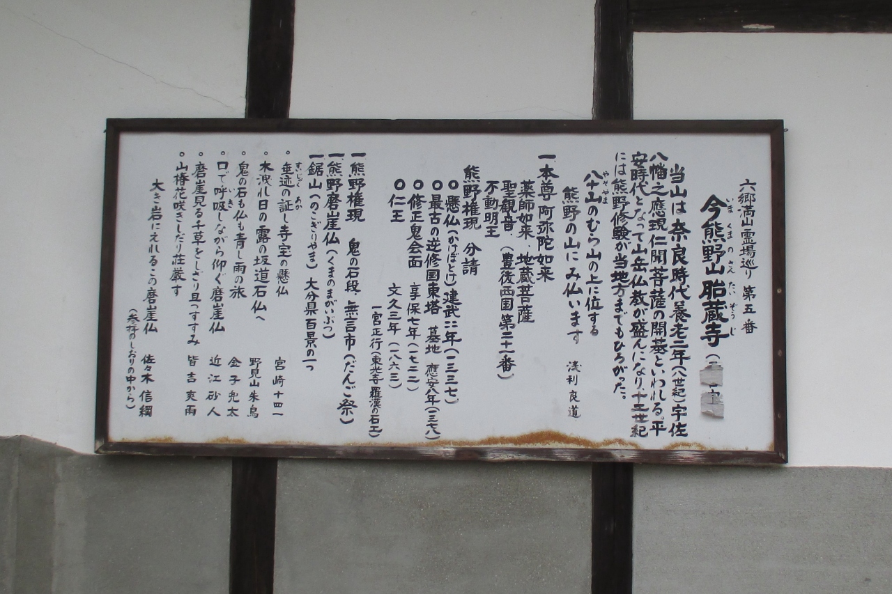 雨が強く降っていたので、熊野磨崖仏を訪れるのは諦めましたが、その石段の始まりのところにあるのが胎蔵寺でした。胎蔵寺は8世紀創建と伝わる古寺で、かつて中世には修行僧や修験者を多く抱える修行の寺であったそうです。そんな修行僧たちが熊野磨崖仏を彫ったのかなと思いましたが、今はお寺よりも熊野磨崖仏の方が圧倒的に人気観光地となっていました。なお、山号は今熊野山で、もちろん天台宗のお寺さんです。