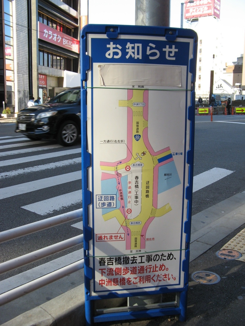 国体道路が那珂川にかかる橋です。訪れた時は老朽化により対策工事が行われていました。幹線道路に架かる橋なので交通量は非常に多く、周辺はビルが立ち並び、デザイン的にも特徴が無い橋なので観光的には面白味はありません。