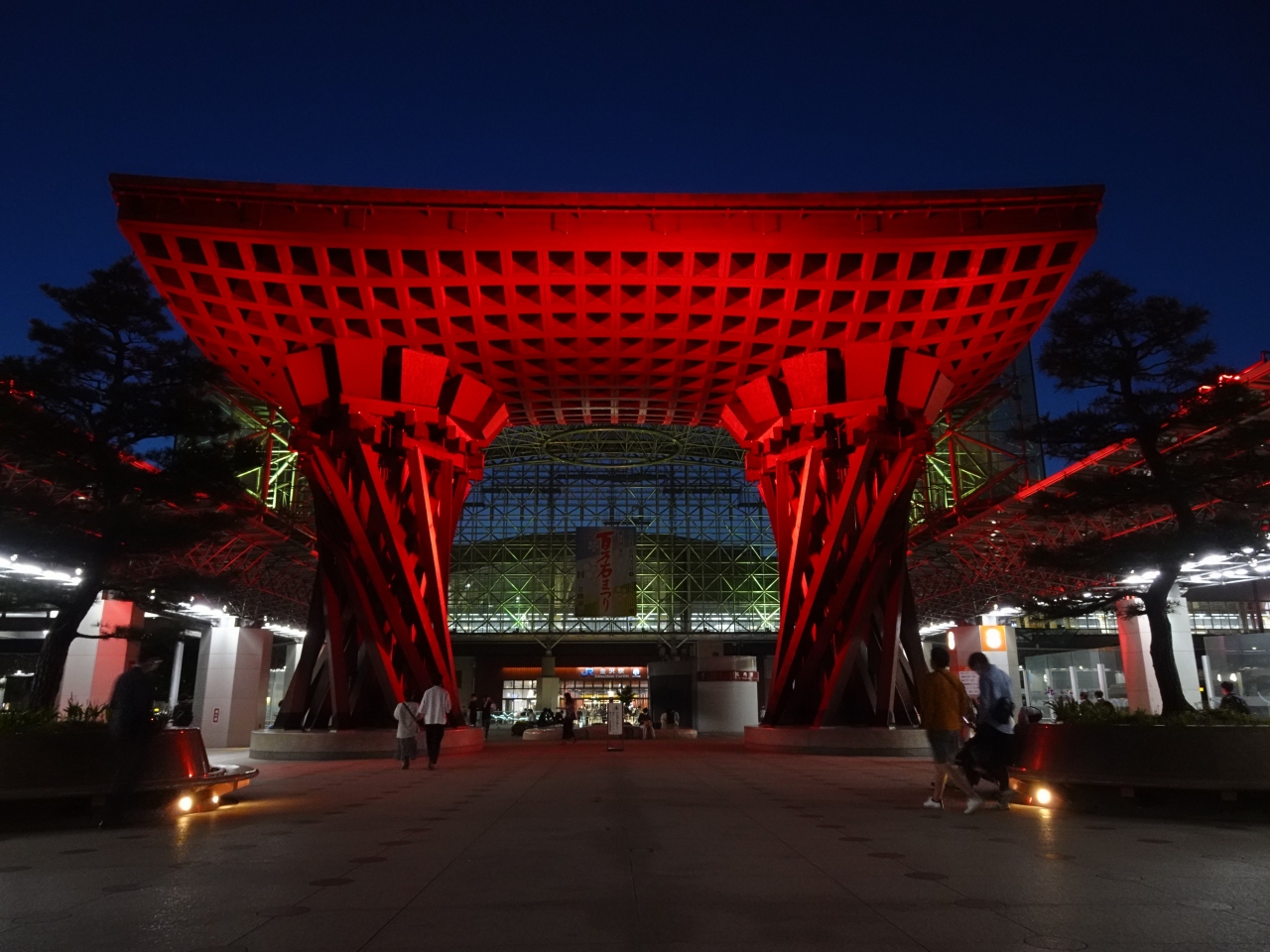 金沢駅東口の広場に建っています。駅から出ると、大きな姿に圧倒されます!!。伝統芸能に使われる鼓をイメージした鼓門。金沢らしさが伝わってきます。夜にはライトアップされ、より美しい姿が見られます。金沢駅のシンボルです!!。金沢観光のスタートに最適ですね♪。