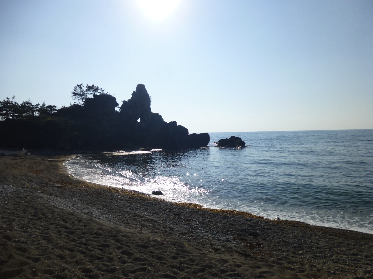 輪島中心部から能登半島の突端へ向かう途中に曽々木海岸があります。海岸の南側にあるのが窓岩です。確かにその名前の通り、板状の岩の真ん中に直径2mほどの穴が空いています。荒波のなせる業ですが、不思議な感じがします。10月から11月、運が良ければ夕日がぴったりと窓にはまる情景が見られるようです。