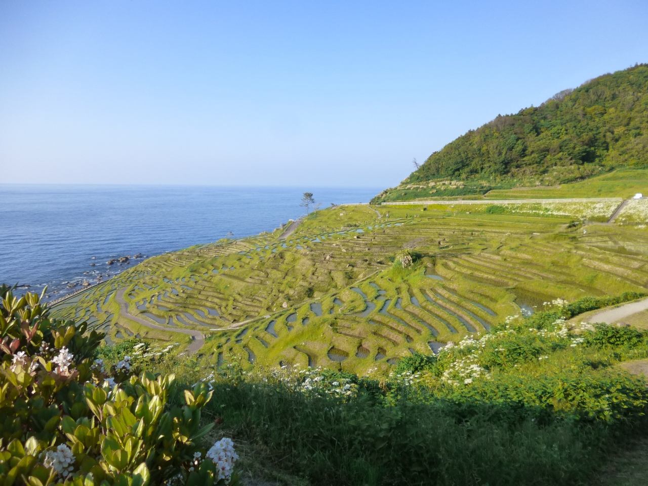 今回の旅の目的の一つ、千枚田。陽の当たり具合を考えて夕方5時ごろ訪れました。駐車場も空いていて、すぐに停めることができました。田植えを始めたばかりのような田は水を多くたたえ空が映っていました。緑の中をうねるような模様をつける水、その向こうに青い日本海というのは、何度も写真で見た風景ですが、やはり来て良かったと思わせる情景でした。