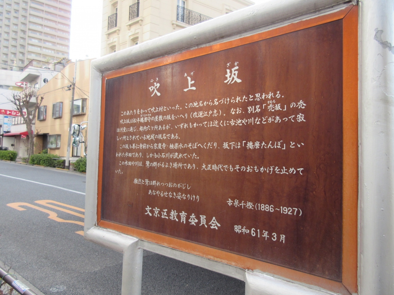 小石川植物園から茗荷谷駅に向かう途中に通りました。桜並木で有名な播磨坂とほぼ並行している通りです。播磨坂の賑わいに比べると静かで落ち着いた通りです。途中には「茶阿局墓碑」がある宗慶寺や善仁寺があり、由来の説明がかかれた標識もあります。
