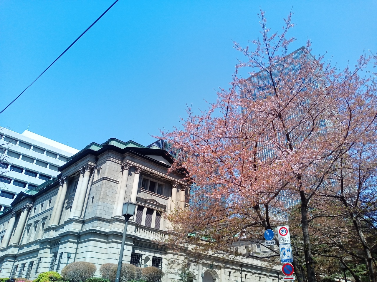 東京・日本橋にある『日本銀行』の前には『江戸さくら通り』があり、桜の咲く季節となるととても綺麗な桜並木となります。日本のお札や硬貨などを思い出すような風景です。