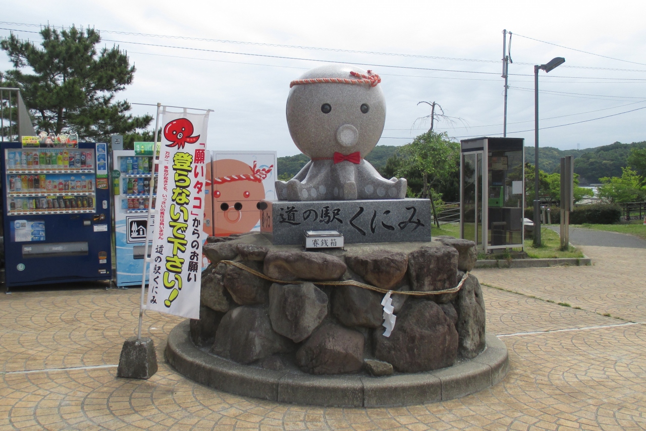 道の駅 くにみは、国道213号線沿いにありました。国東ではブランドだこの「くにさき姫だこ」が有名だそうで、道の駅 くにみの一押しは壁に大きく書かれているたこめしの様です。そして、願いダコという石像が堂々と置かれていました。何と賽銭箱まで置かれていました。道の駅のすぐ隣には大きなくにみ海浜公園があり、一体として開発された様でした。