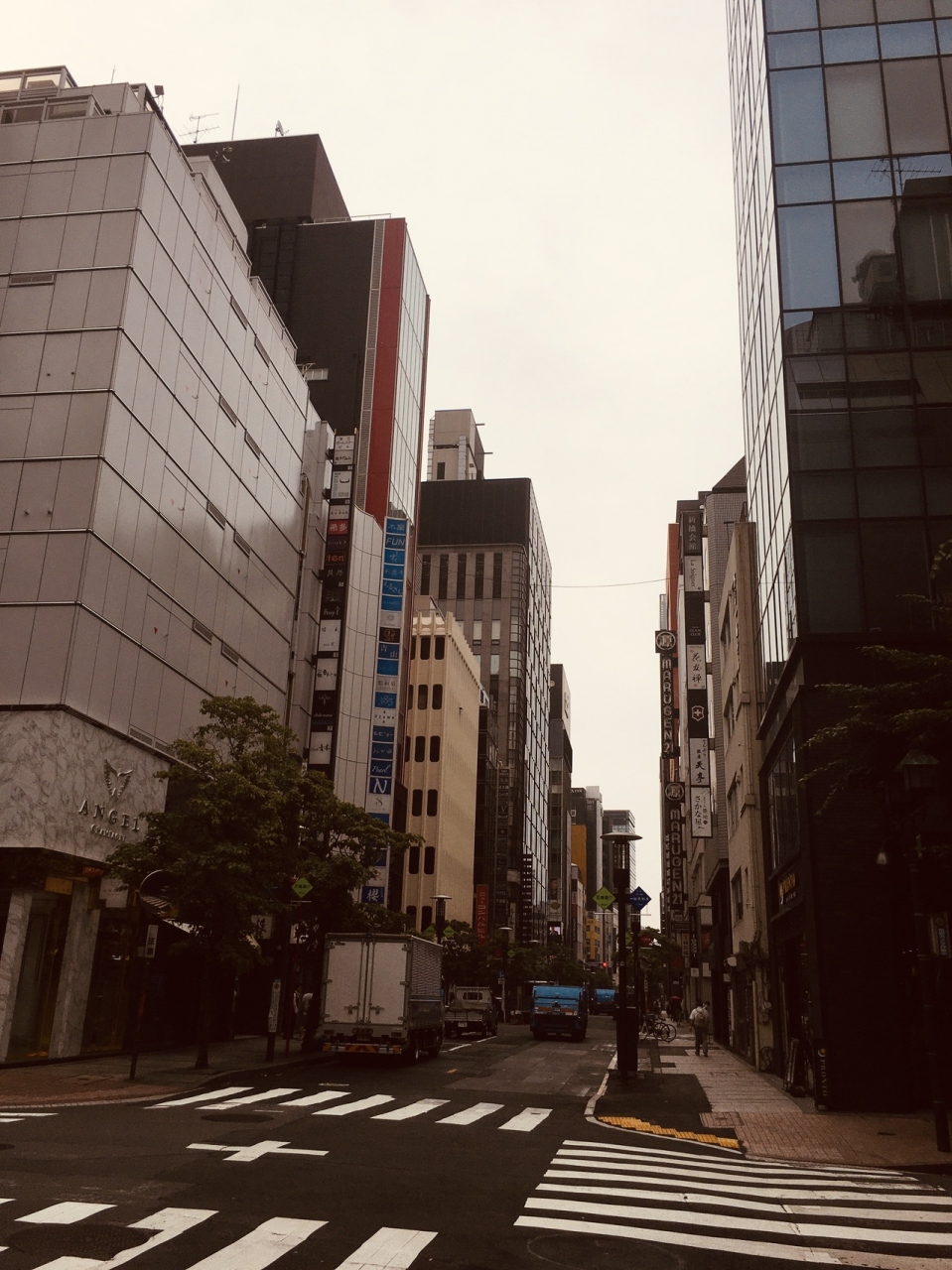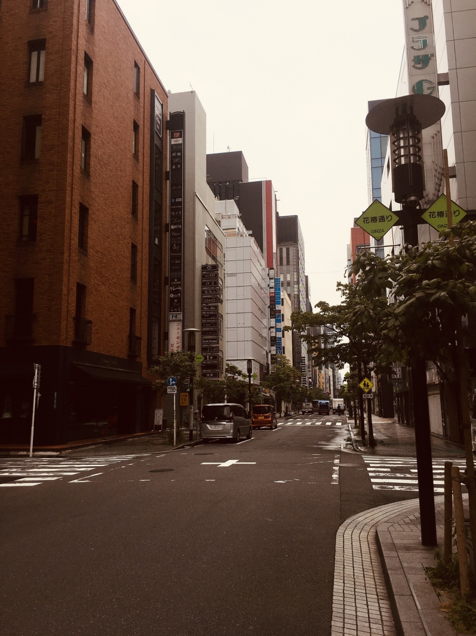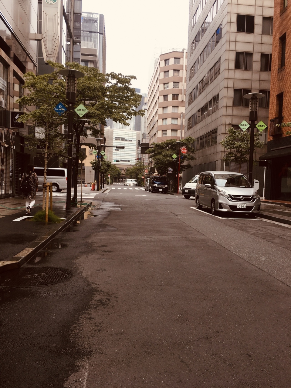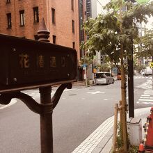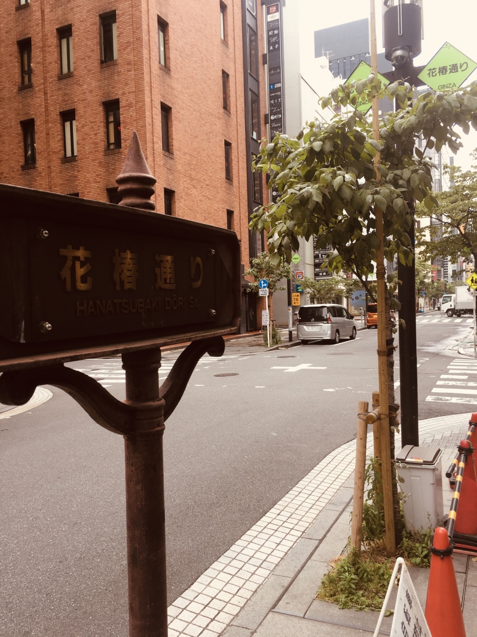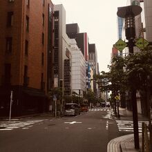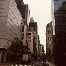 一方通行でしたが自動車はすれ違いが出来る広さもあり、路上駐車スペースもありました。ところどころ木が立っていましたが、椿の木かは分かりませんでした。ビルには看板があるビルが多く、枝分かれした道以外は左右にビルが連なっていました。