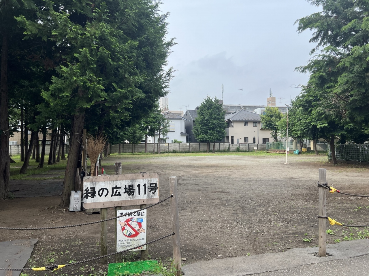 小田急線の南林間駅西口から歩いて12分、静かな住宅街の中に、空き地のようなスペースがあります。これが「緑の広場11号」で、入口には看板もたっています。入口には、子どもたちの遊び場、多目的に地域の人が使うところ、というような説明書きがありました。