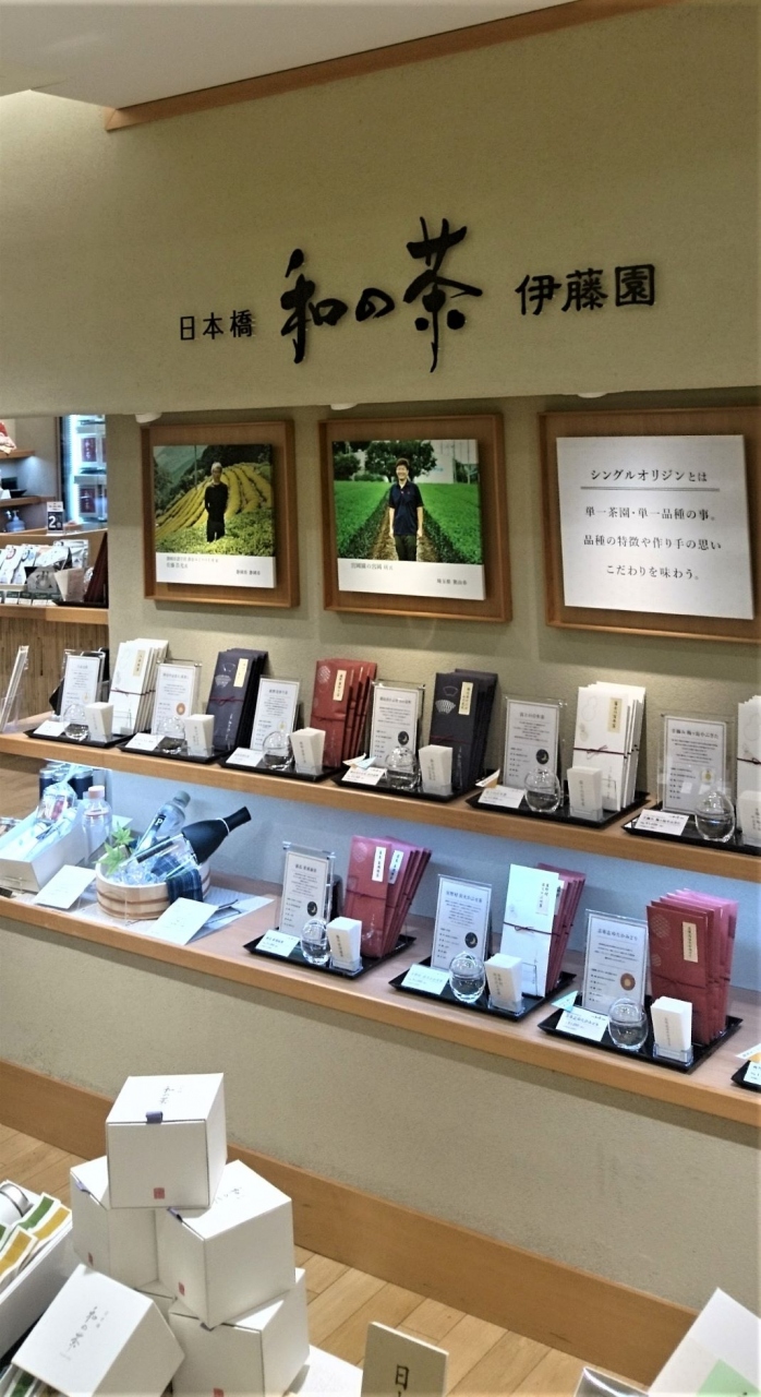 日本橋三越の地下1階食品売り場の奥まった場所にある日本茶の専門店。伊藤園がペットボトルのお茶以外にもこうした本格的な売場を経営しているのを初めて知った、この店には和菓子とお茶を一緒に楽しめるイートインコーナーもある。