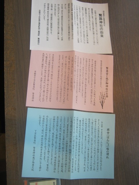 繁昌神社の本殿前、お賽銭箱の横付近には、白・水色・ピンクでそれぞれ「繁昌神社の由来」「班女塚の謂れ」「繁昌宮と桃の御神紋のお話」と題した、持ち帰り可能なプチ解説が用意されていて、これがとても勉強になるので、是非お手にとって、この神社の歴史に思いを馳せられると、また味わい深い旅になってお勧めです。
