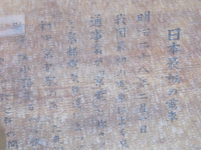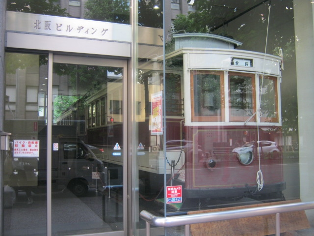 ここの市電が文字通り、日本最古の電車として保存されていて、烏丸通沿いの目立つ場所にありますが、ガラス窓が反射して、正面を撮り辛い上、隣がビル内に入る自動ドア入口になっていて、内側でも落ち着いて写真を撮れないストレスを感じます。