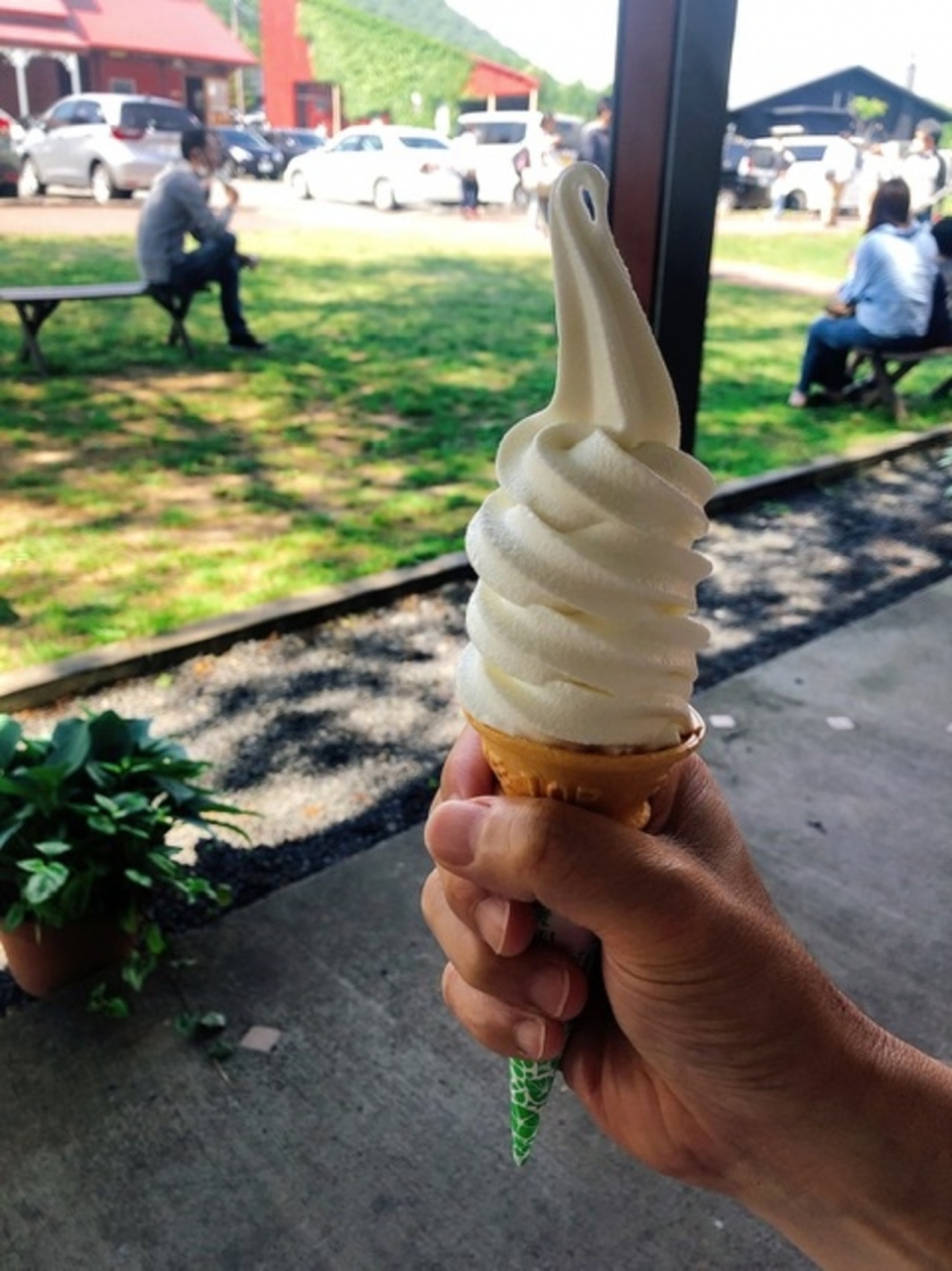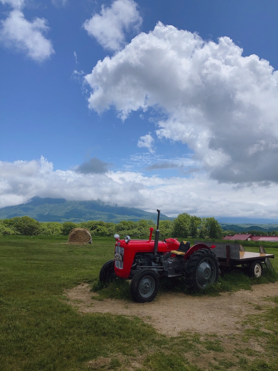 赤いトラクターの近くで羊蹄山をバックに記念写真を撮り、アイスクリームを食べ、野菜や雑貨、お土産も買えます。