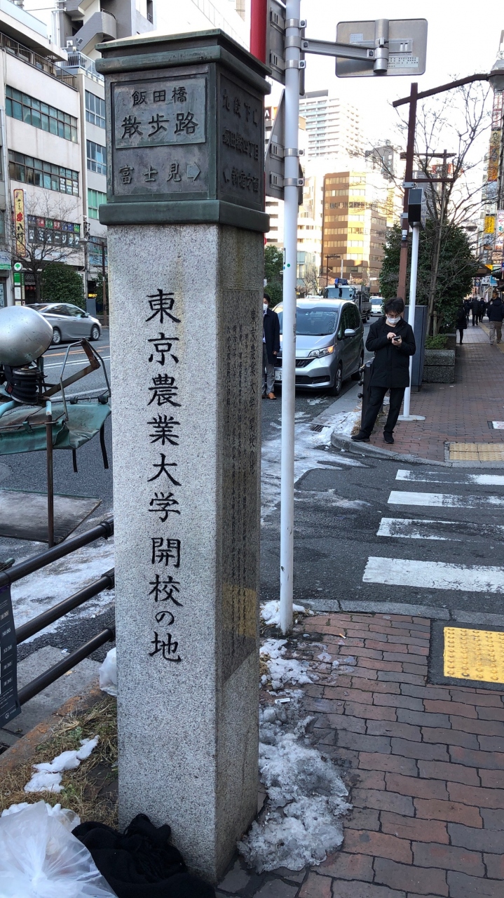 飯田橋駅の近くにある石碑です。「飯田橋散歩路」と名付けられた道の途中にあります。現在は世田谷にキャンパスがある東京農業大学ですが、はじまりはこのエリアです。1891(明治24)年, 榎本武揚によって「徳川育英会育英黌農業科」が創立されました。