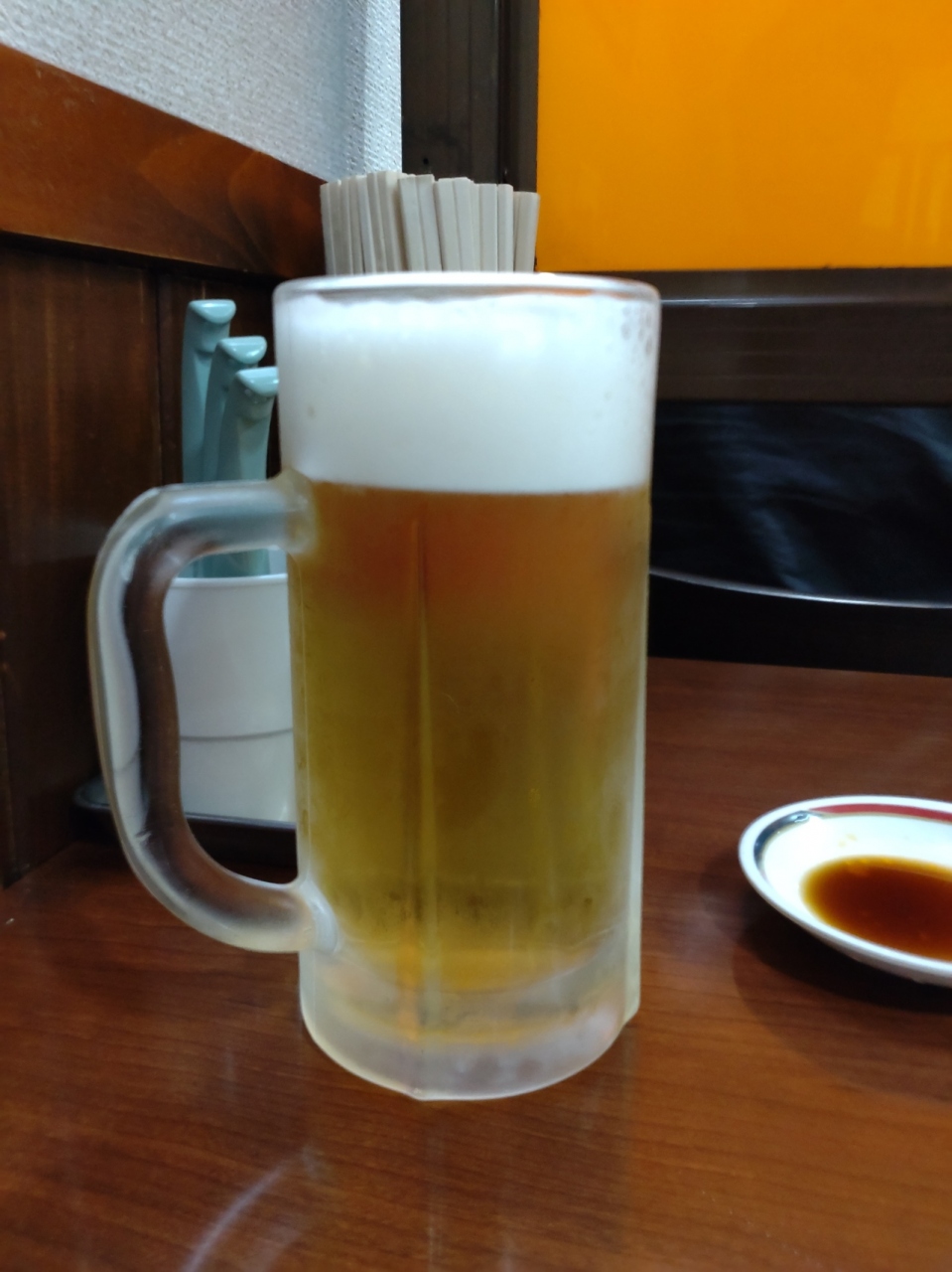 辛みそラーメンかバターコーンラーメンで迷いましたが、お店の人から「バターコーンがオススメ」とのことでこちらをオーダー。また、ビールのアテに餃子も頼む。