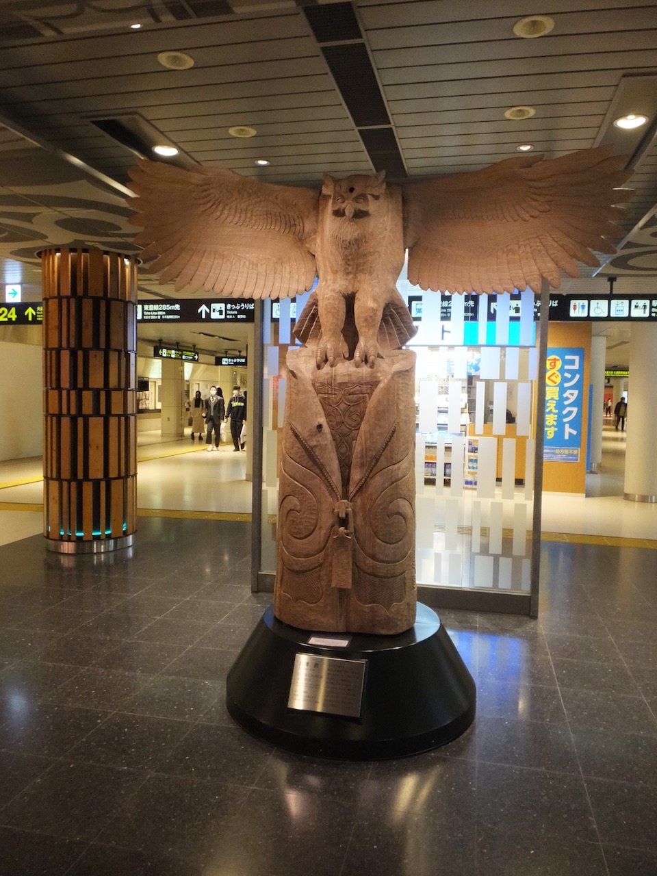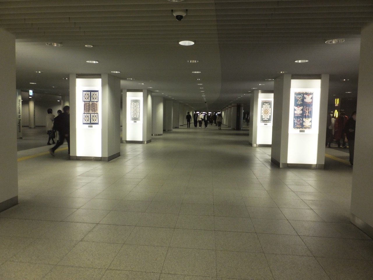 札幌駅の地下、大きな空間にアイヌの刺繍が飾ってあったり、おおきなシマフクロウの彫刻が置いてあったり。