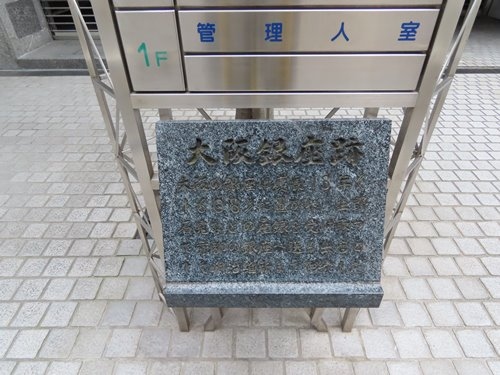 大阪にも「銀座」があったのですね。江戸時代にはここを経由して生野や石見の銀が運ばれていったそうです。目印が「三精ビル」ということで探してみると、史跡プレートが珍しい場所に埋め込まれていました。建物を建築する際にデザイン・機能の邪魔にならぬよういろいろ工夫があるのだと思いますが、どうせ誰も探さない、探せない的な扱いはチョット残念。