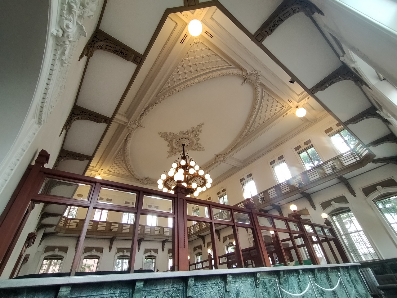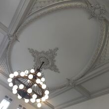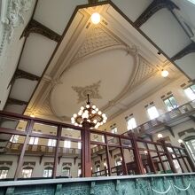 旧営業室の天井照明と漆喰細工は圧巻です。お客さんに対応するカウンターやロビーがある部屋で、天井は吹き抜けでとても空間が広く感じられます。天井一面に漆喰細工が施されているので、当時のお客さんも見上げたことでしょう。蛇紋岩のカウンターテーブル、輸入の床タイル、各部屋のマントルピース。とても豪華な作りで、見とれてしまいました。