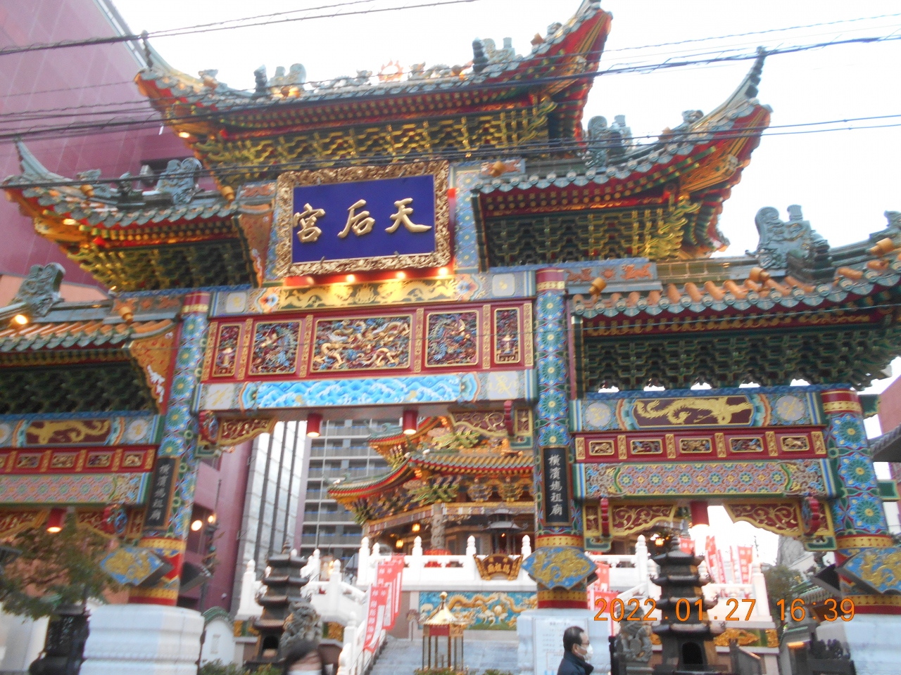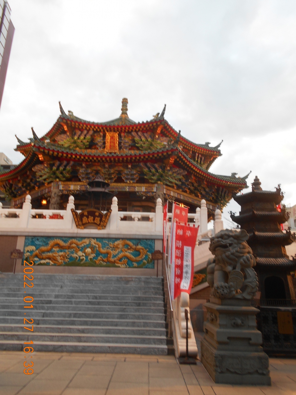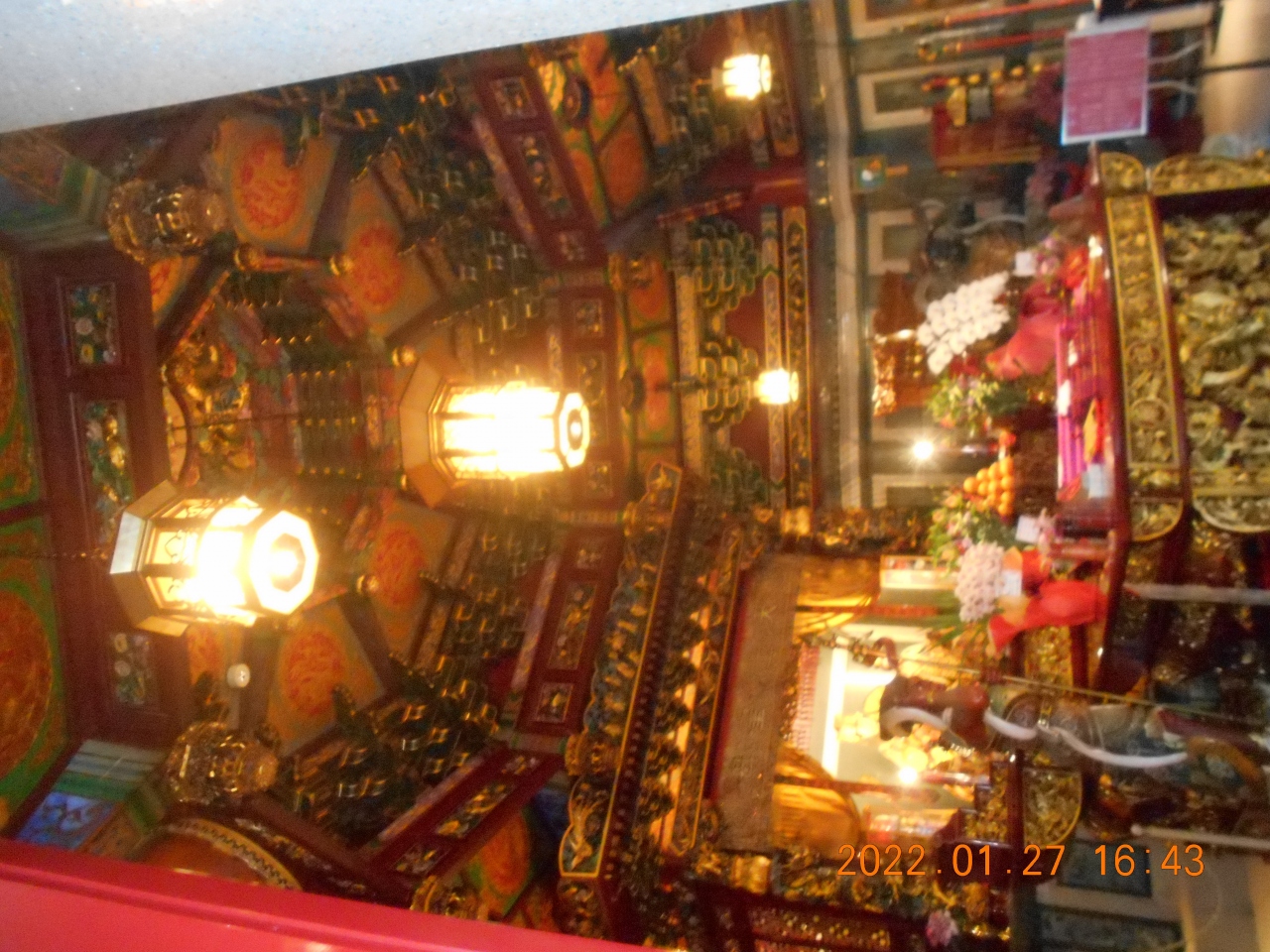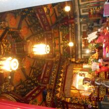 横浜中華街を歩いていてとてもきらびやかな門があり、その中に入ってすぐに階段があり、のぼっていくと同じようにきらびやかな建物がありました。建物の内部の天井などもとても細かい装飾があり、お供え物などが飾られています。