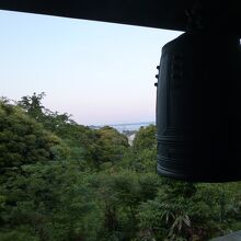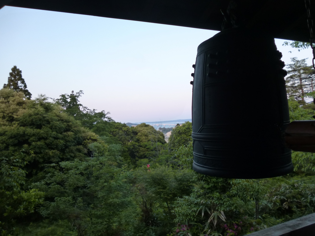 和倉温泉の温泉街から西側に行ったところに、青林寺があります。本堂の横にある階段があり、竹林の中を登って行く事ができます。ホトトギスやほかの鳥たちの声を聴きながら散策を楽しみました。500段ほどの階段を上がると、展望台があります。木々が茂っていますが、七尾湾や能登大橋を見ることができます。また「和みの鐘」があり、鐘を撞くこともできました。