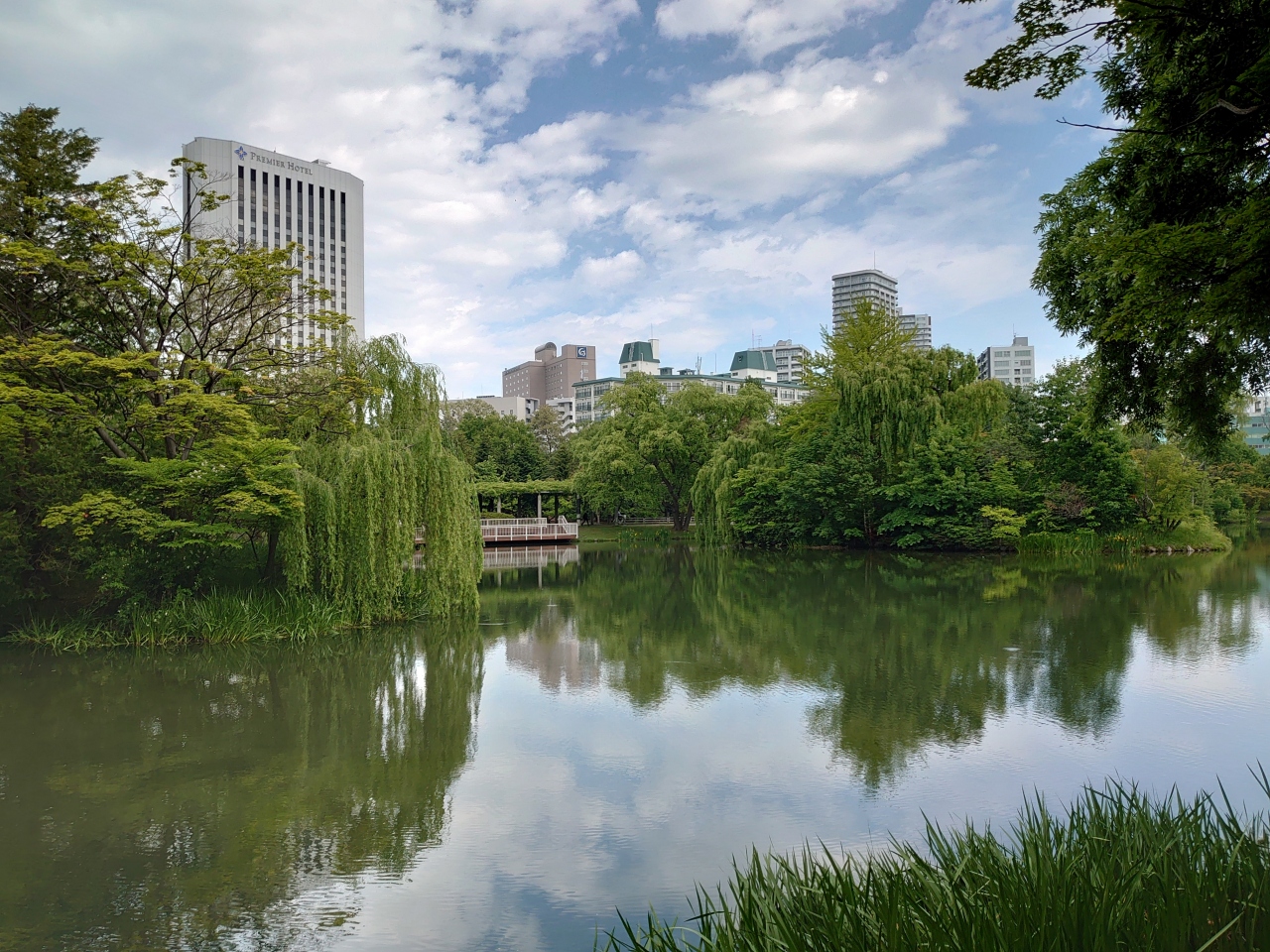公園はハトやカモなどの鳥たち、人々が憩う姿にほっこりです。公園内の植物も整備されその公園の背景にはホテルのビルが建つなど洗練された公園だと思います。大通公園と同じく札幌市になくてはならない都会のオアシスな公園です。