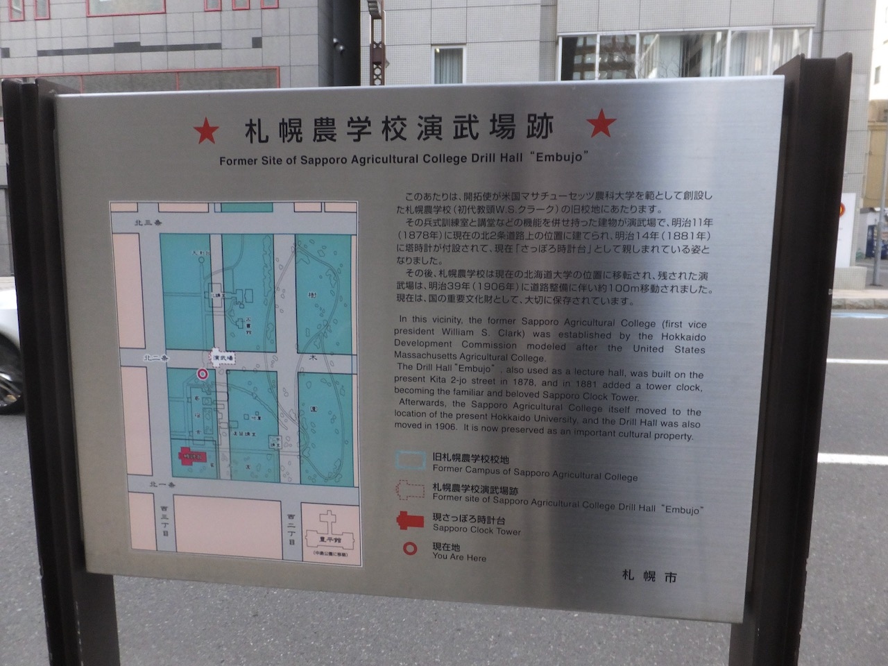 札幌時計台は今の場所になったのは明治39年。北大が今の場所に移転したときに札幌市がこの建物を譲り受けたのですが道路整備に伴い、100m移動して今の場所に来たのだそうです。その元の場所を示す記念碑がこの「札幌農学校演武場跡碑 」です。