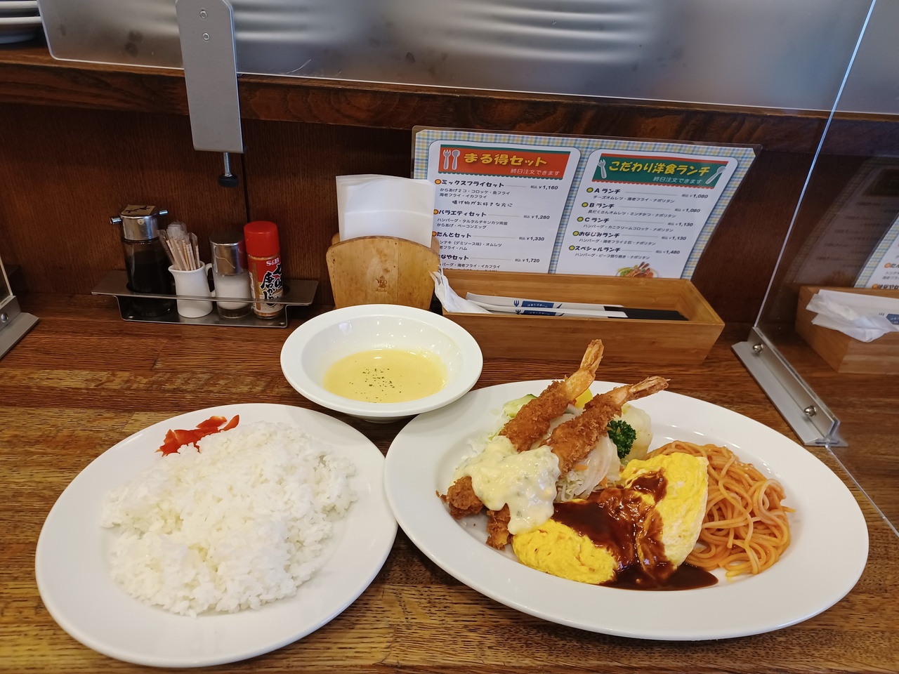 Aランチというチーズオムレツ、海老フライ、ナポリタンのセットをオーダー。ボリューミーです。素朴ですがとても美味しかったです。