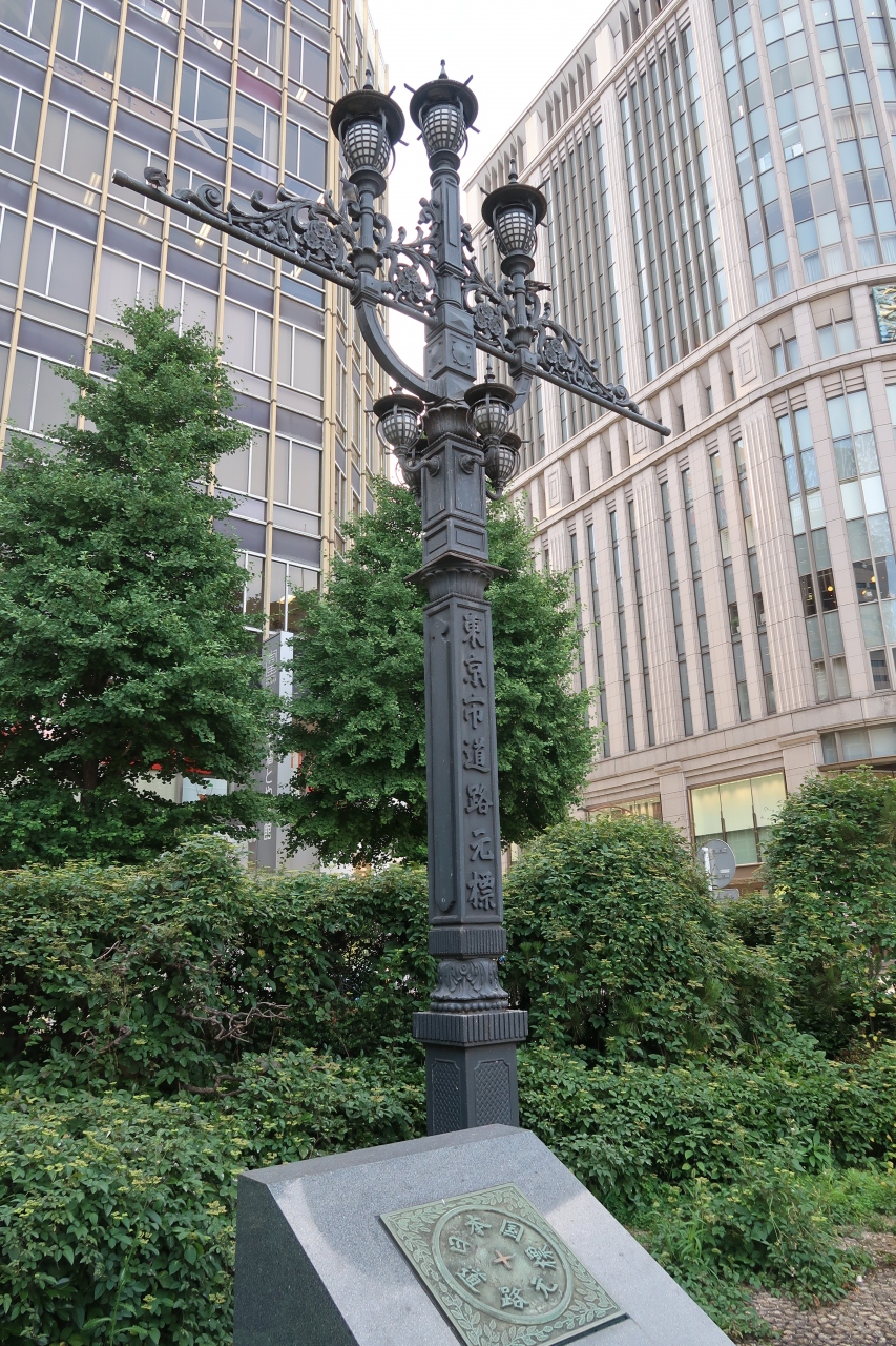 日本橋の北の袂に立っていました。元々は日本橋の中央部を往復する市電の2本の線路間に立てられていたのを移設したとこのこと。柱部分に「東京市道路元標」と刻まれ、上部に大きめの丸い街灯が3個配置されています。唐草文様の装飾にはちょうど3羽(多分)の鳩が止まっていて、まるで彫刻の一部のようでした。