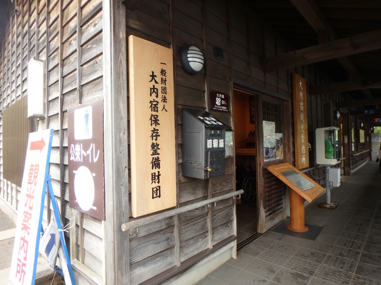 大内宿の手前の駐車場の中に観光案内所とトイレがあります。自家用車はこの駐車場に停めて徒歩で大内宿にいく必要があります。観光案内所でパンフレットなどの資料をもらい、観光前にトイレに行くべきです。湯野上温泉駅からの乗り合いバスの猿游号の停留所はここを超えて200メートルくらいのところにあります。