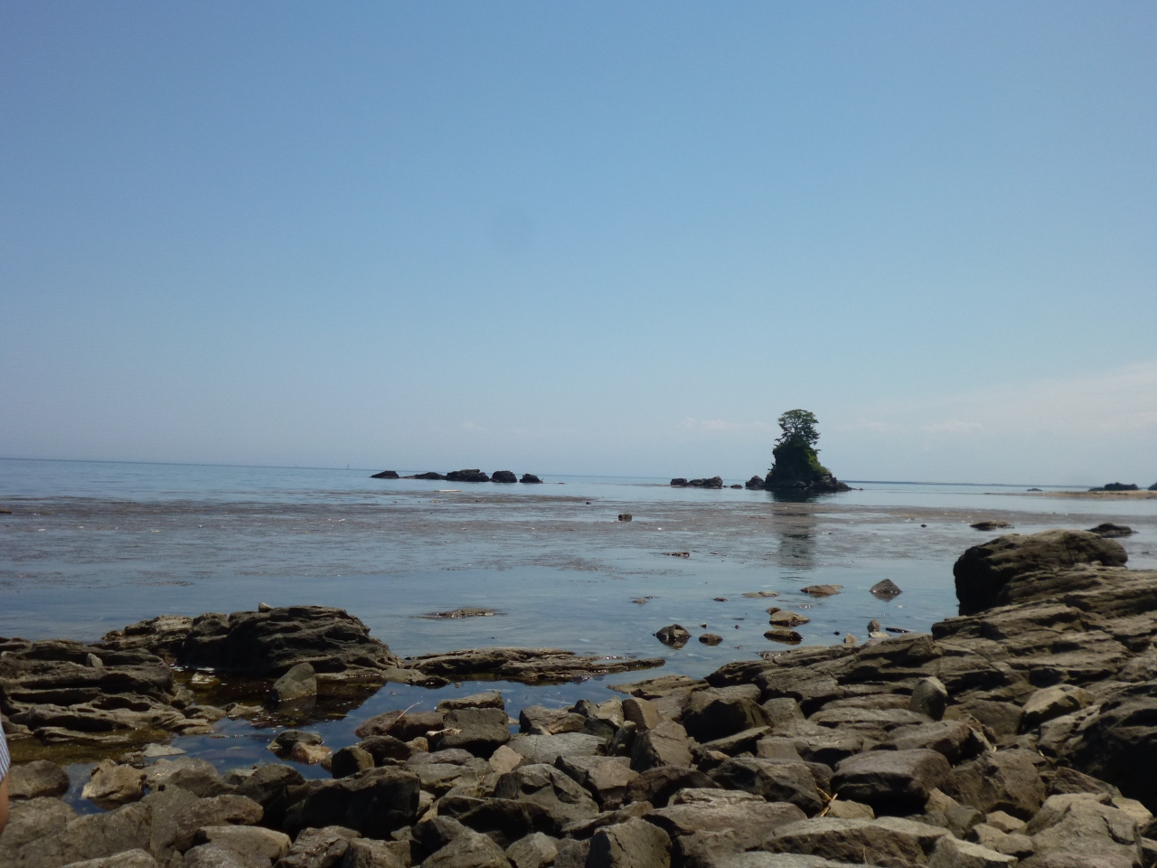 富山の景勝地、雨晴海岸の沖にある岩で、立山連峰をバックにした風景は写真などでよく見るのが女岩です。周囲の小さな岩が母親とたくさんの子供のように見えることからこの名前が付いたようです。訪ねた時にはもやがかかっていて、立山連峰はほとんど見えませんでしたが、きれいな風景は楽しめました。