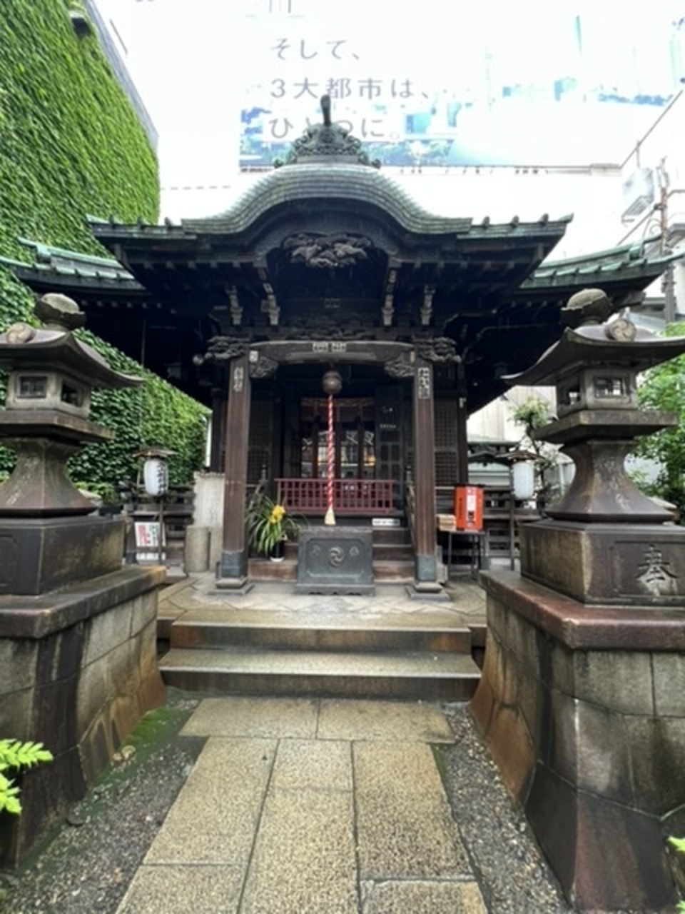品川駅高輪口を出て第一京浜を渡って左に行くとすぐにあります。建物と建物の間にひっそりとある小さなお稲荷さまです。