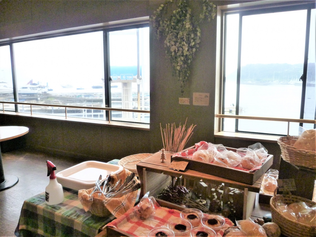 東-叶神社⇔鴨居団地の市道にあります、ヨットの`サニーサイドマリーナURAGA`の2F<海の観えるパン屋さん ワンこぱん;One-Copain>です。なんといっても2Fで浦賀湾の景色が観えてテープル席が並んだパン屋さん…Msご主人が親切で、カレーパン/クロワッサン(プレーン,シュガー)を食べて風景を楽しみました(^^)