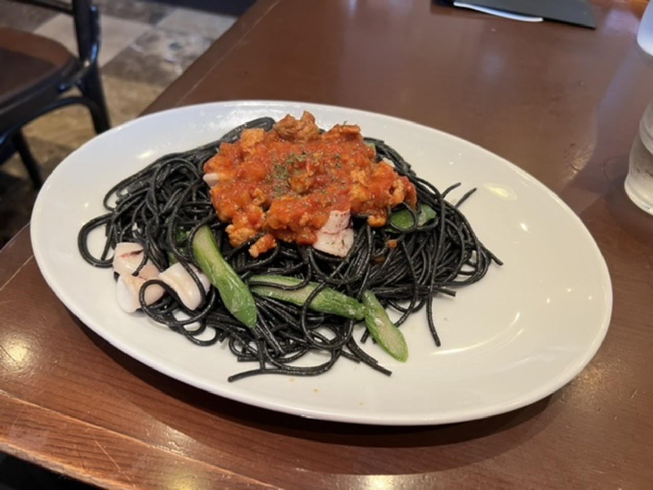 食べたのは産直アスパラガスとヤリイカの魚介出汁ペペロンチーノ!イカ墨を練り込んだ黒い麺です。美味しいですね。