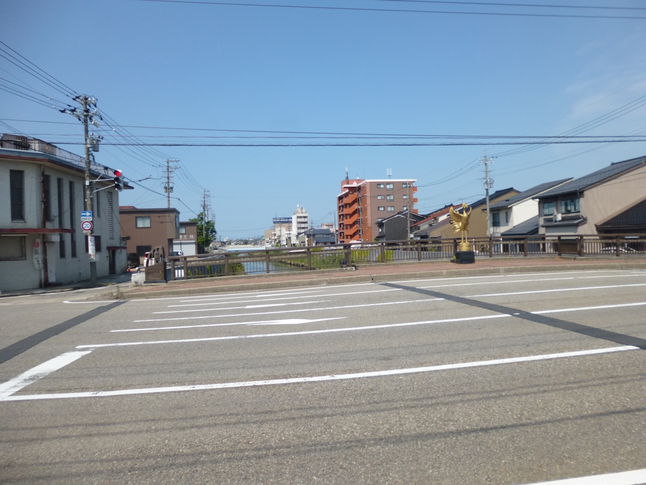 高岡市市街地西側を流れる川、千保川に架かる橋で、千本格子の街並みで知られた金屋町と川原本町を結ぶ橋です。両歩道中間部に金色の鳳凰像を設置したテラスがあるのが特徴的な橋です。名前の由来は、2代藩主前田利長が高岡開町の時に町名を中国の詩経の一節からつけ、その詩経の一節にあった鳳凰の名があったことによるものだそうです。鳳凰は上流が雄、下流が雌だそうです。