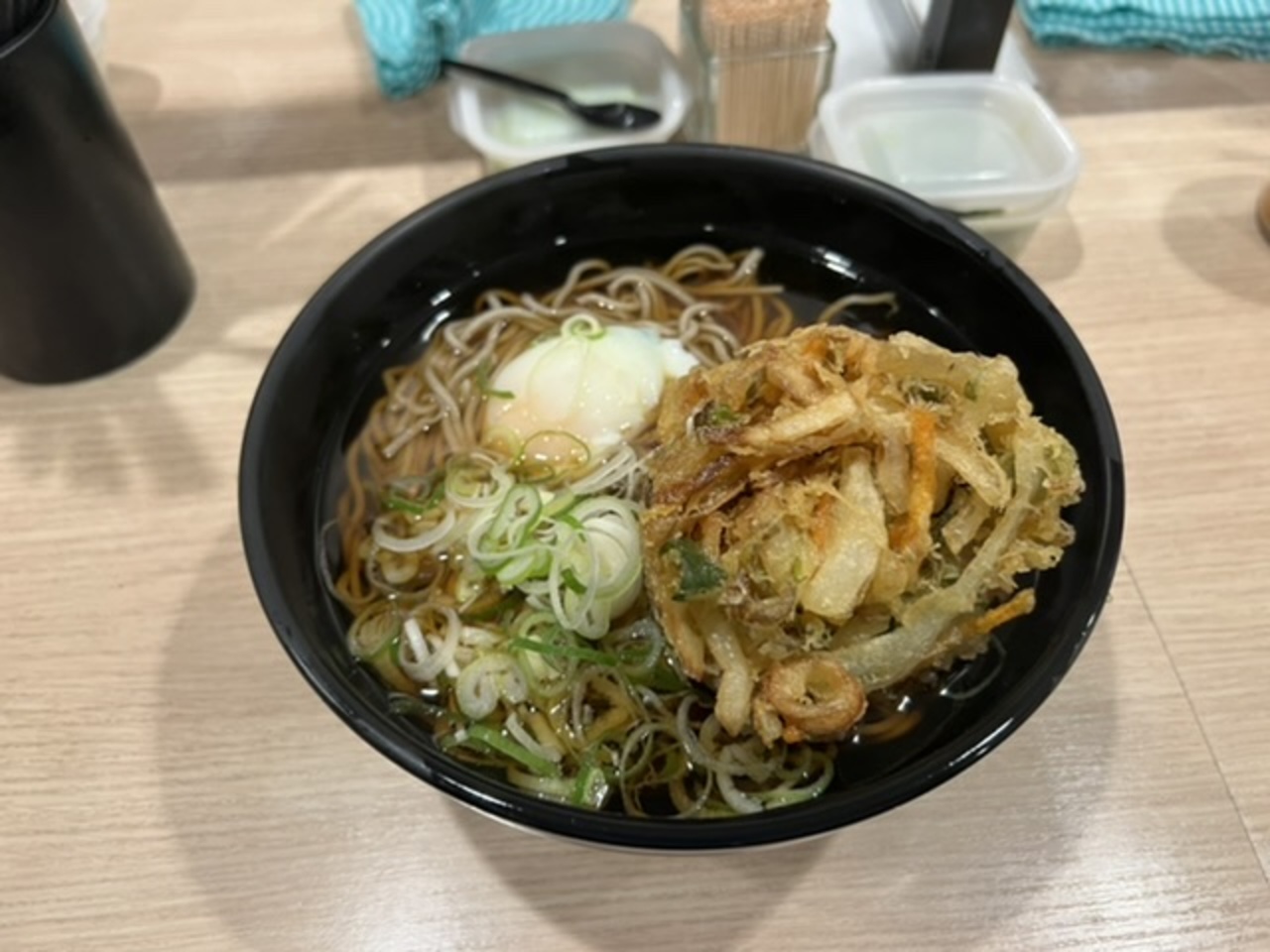 食べたのはかき揚げ温玉蕎麦640円!カリカリの大きなかき揚げ天ぷらに温玉が入ってて美味しいです。
