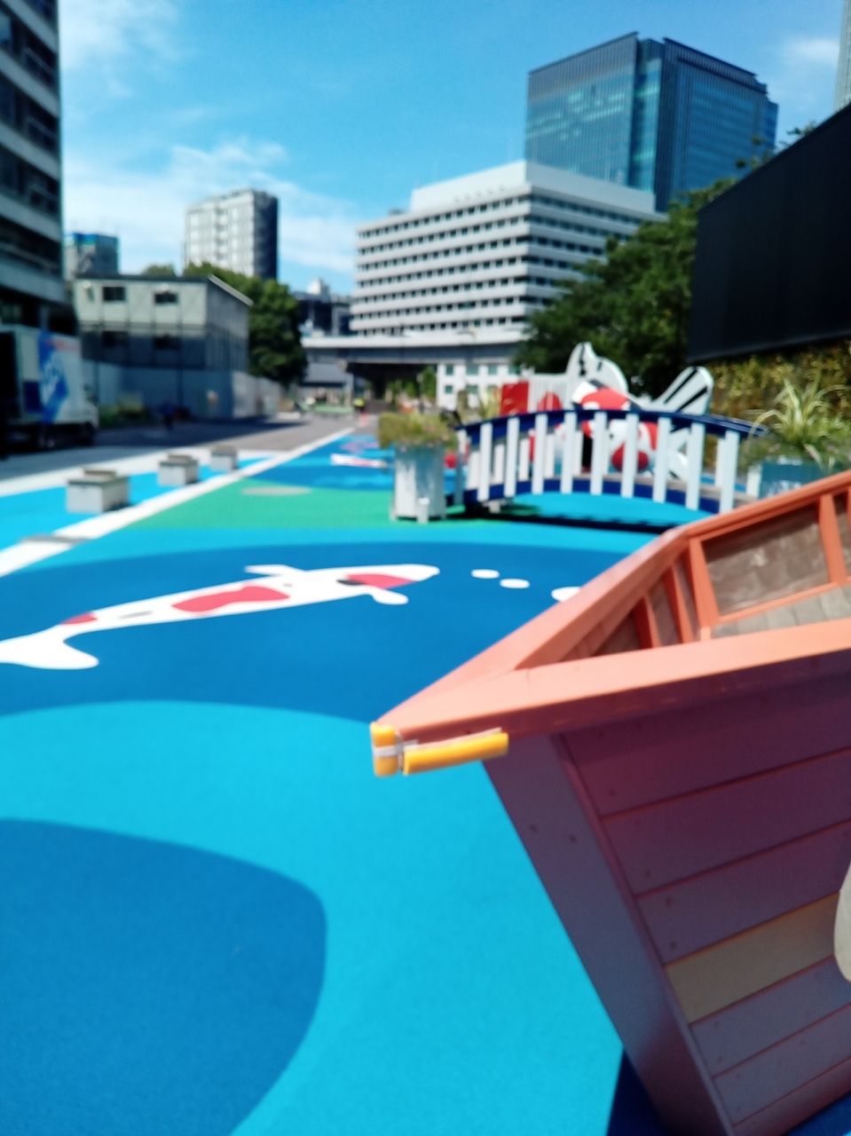 いろいろなオブジェがあったり、新潟県小千谷の錦鯉が泳いでいたり、ちょっとオアシス的な感じで休まれていらっしゃる方が多かったです。