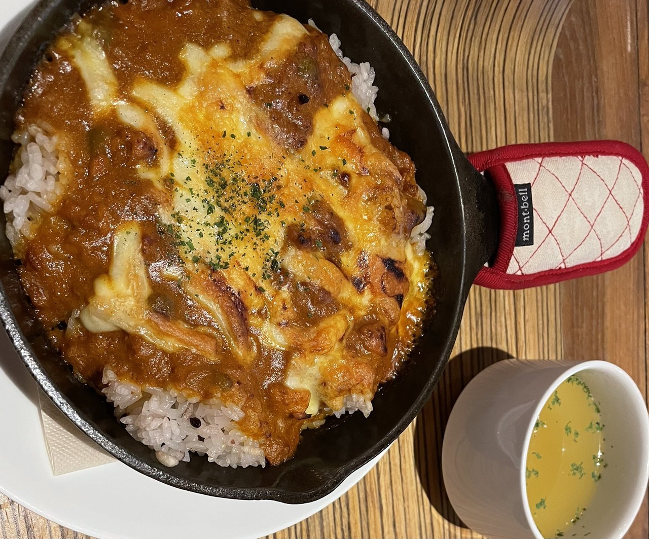 アウトドアブランドでお馴染みの「モンベル」が展開してるレストランです。焼きカレーセットにしてみました。スキレットで焼き上げてるのがさすがモンベルだなぁと感心しました。チーズがのっていて美味しかったです。