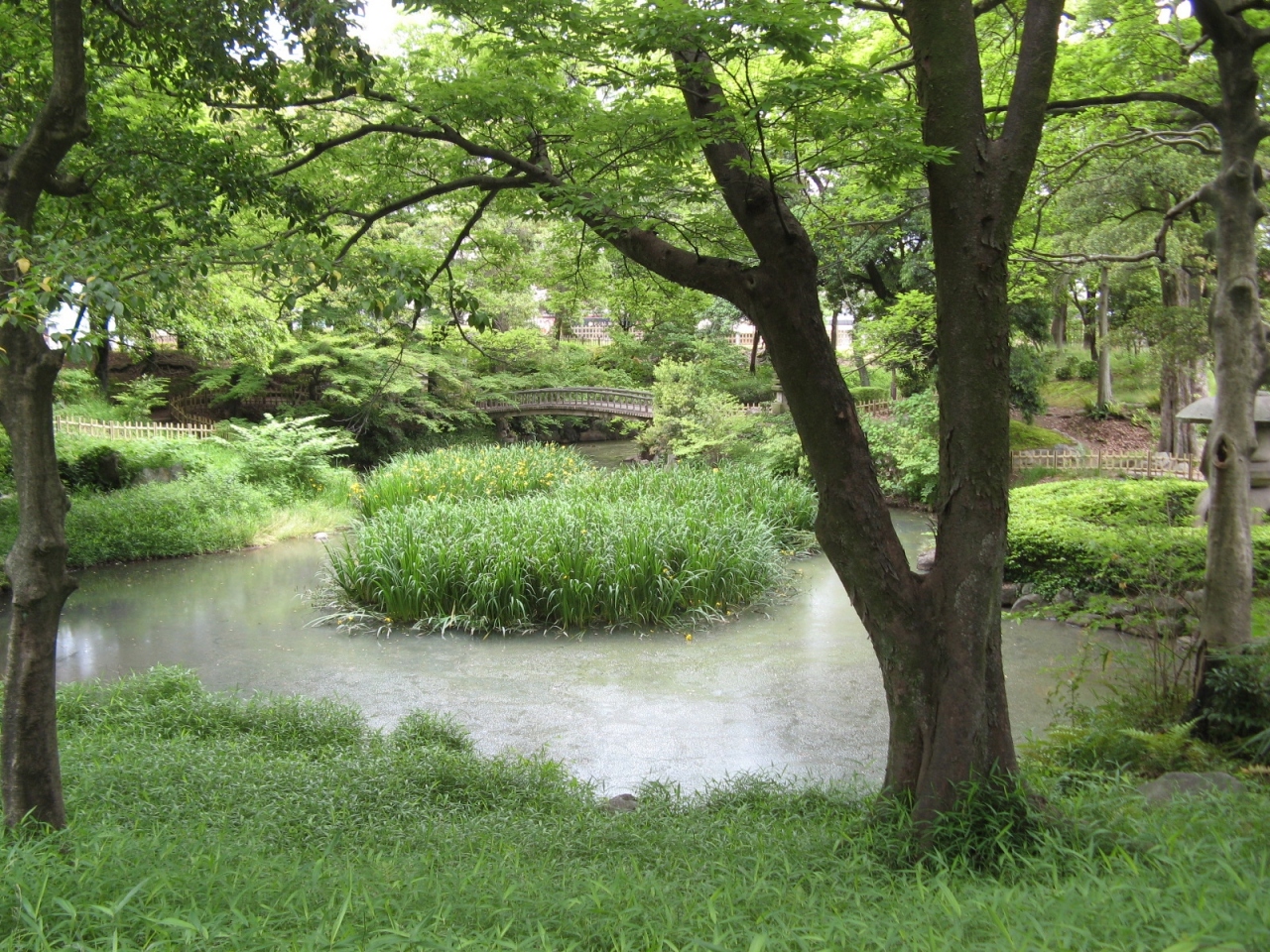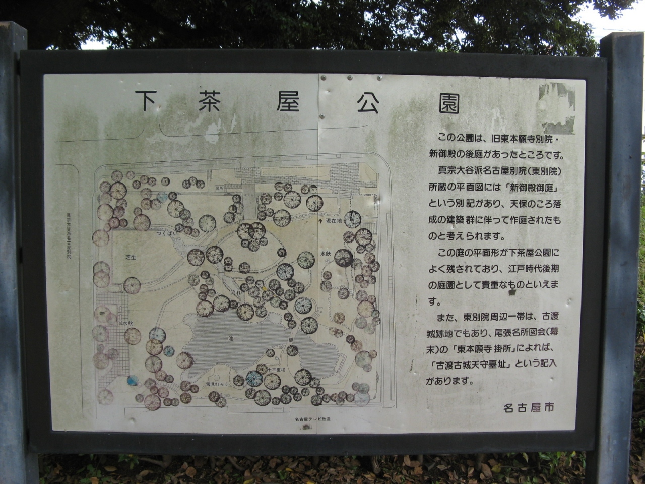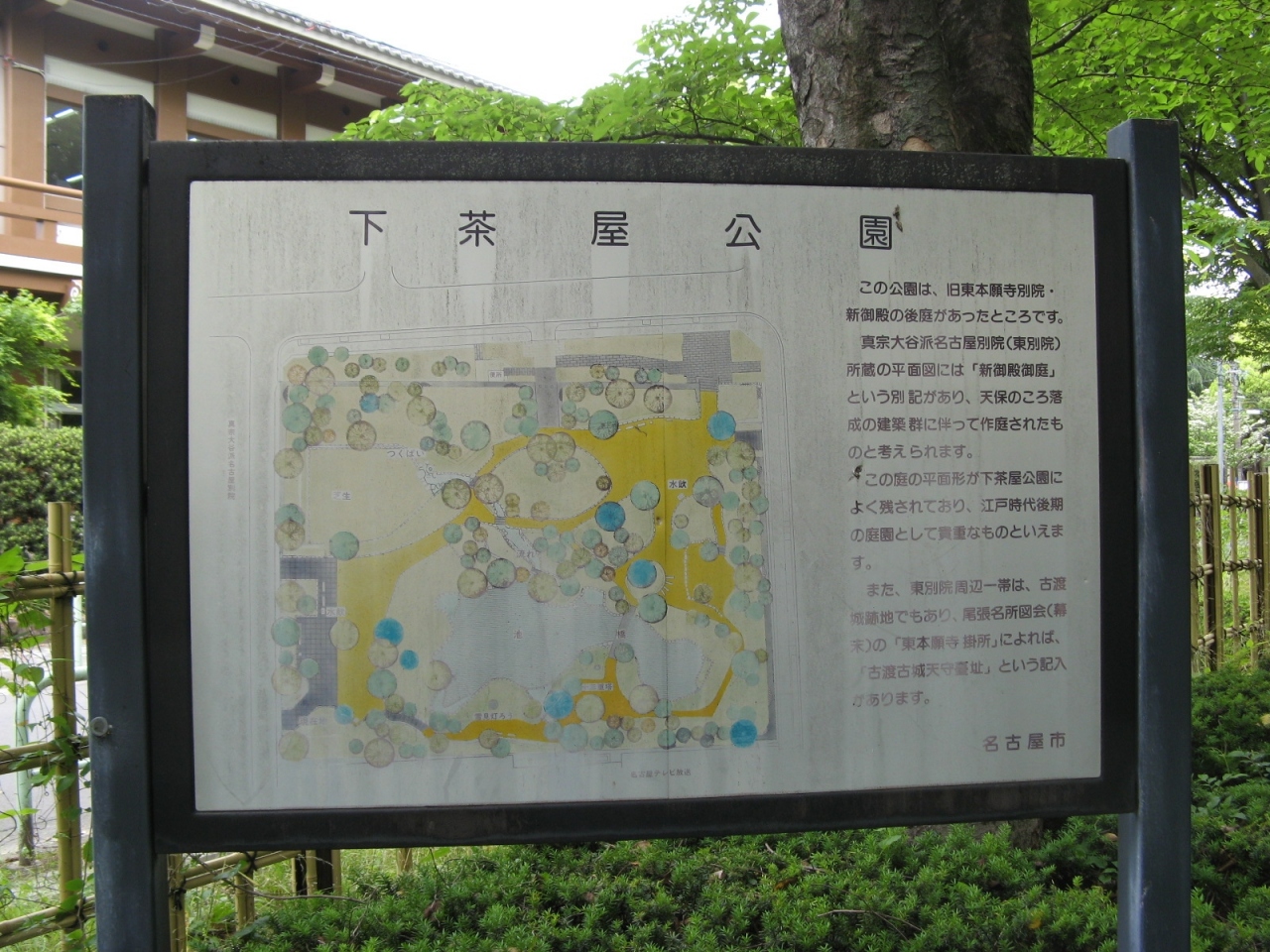 現地にあった説明板(添付写真)によると、旧東本願寺別院の新御殿の後庭があったところだそうです。公園内は、緑豊かで池には橋が架かり、池の周りには三十塔や雪見灯篭があって、都会のど真ん中にある公園とは思えないほど静かで良い雰囲気が良かったです。街歩きの休憩場所としては穴場的なスポットだと思いました。