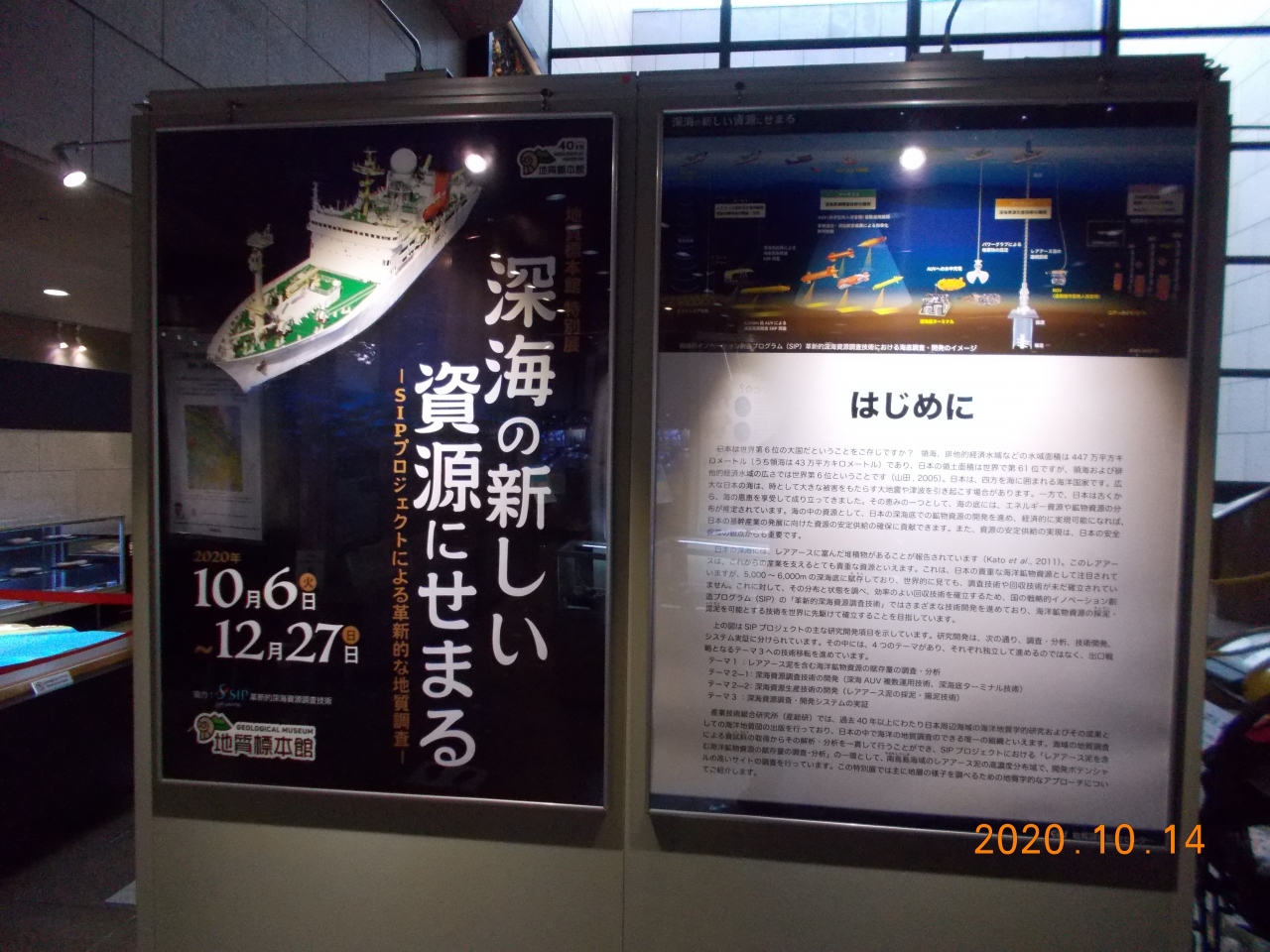 企画展「深海の新しい資源にせまる」と「海で暮らしていた?デスモスチルス」を開催していた。海に囲まれた日本の周辺で取れるコバルトやマンガン、レアアースなどについて実際に取った石などが展示されていた。また、デスモスチルスの化石とともに、特徴的な葉の形や食べ物などが開設されていた。