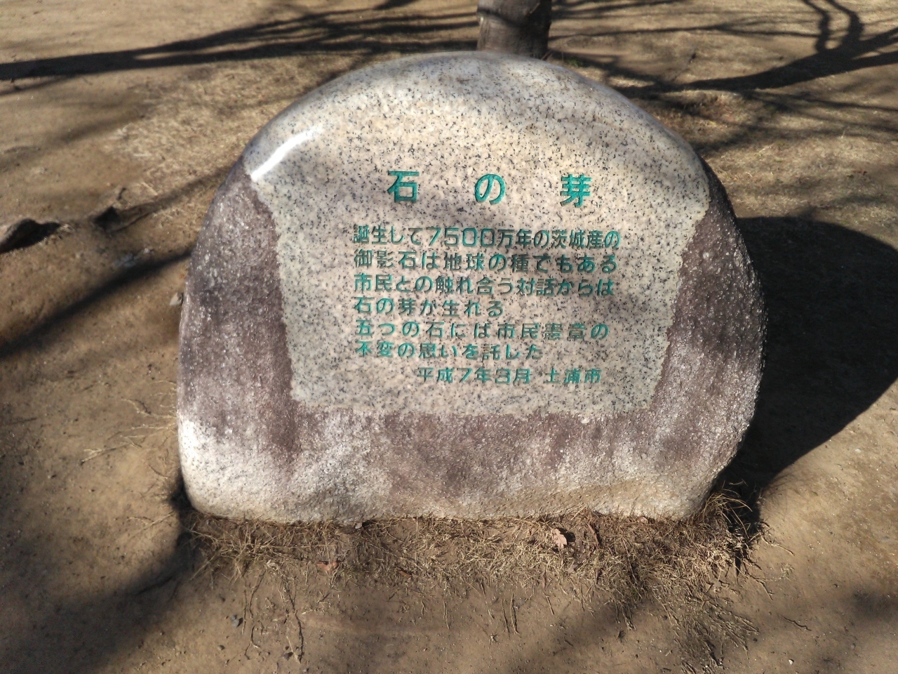 大きな石の上に小さな石がいくつか載っている石や、座るような高さの背の低い石までいくつかの大きな石が鎮座している。これらは、7500万円前に誕生した茨城産の御影石らしい。石の芽として、土浦の市民憲章には5項目があるようで、5つの石が置かれているということだった。