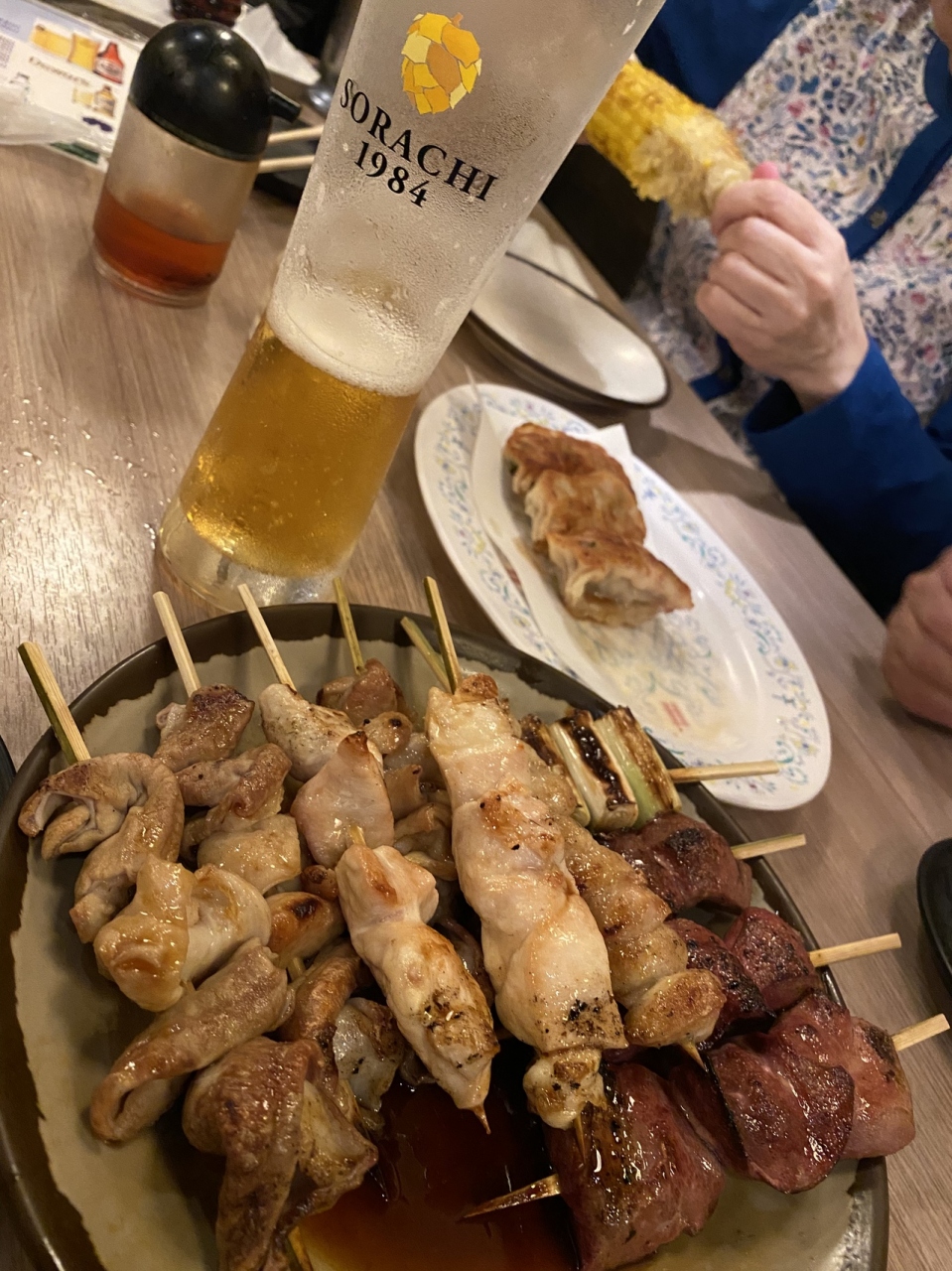 吉祥寺の焼き鳥の名物店です。この日は妻子を義実家に預けて、両親に吉祥寺で合流。雨の中少し待っただけで入れました。焼き鳥を好きなだけ注文しつつも、焼きとうもろこしや餃子も注文。刺身は普通ですが、焼き料理はどれも絶品でした!