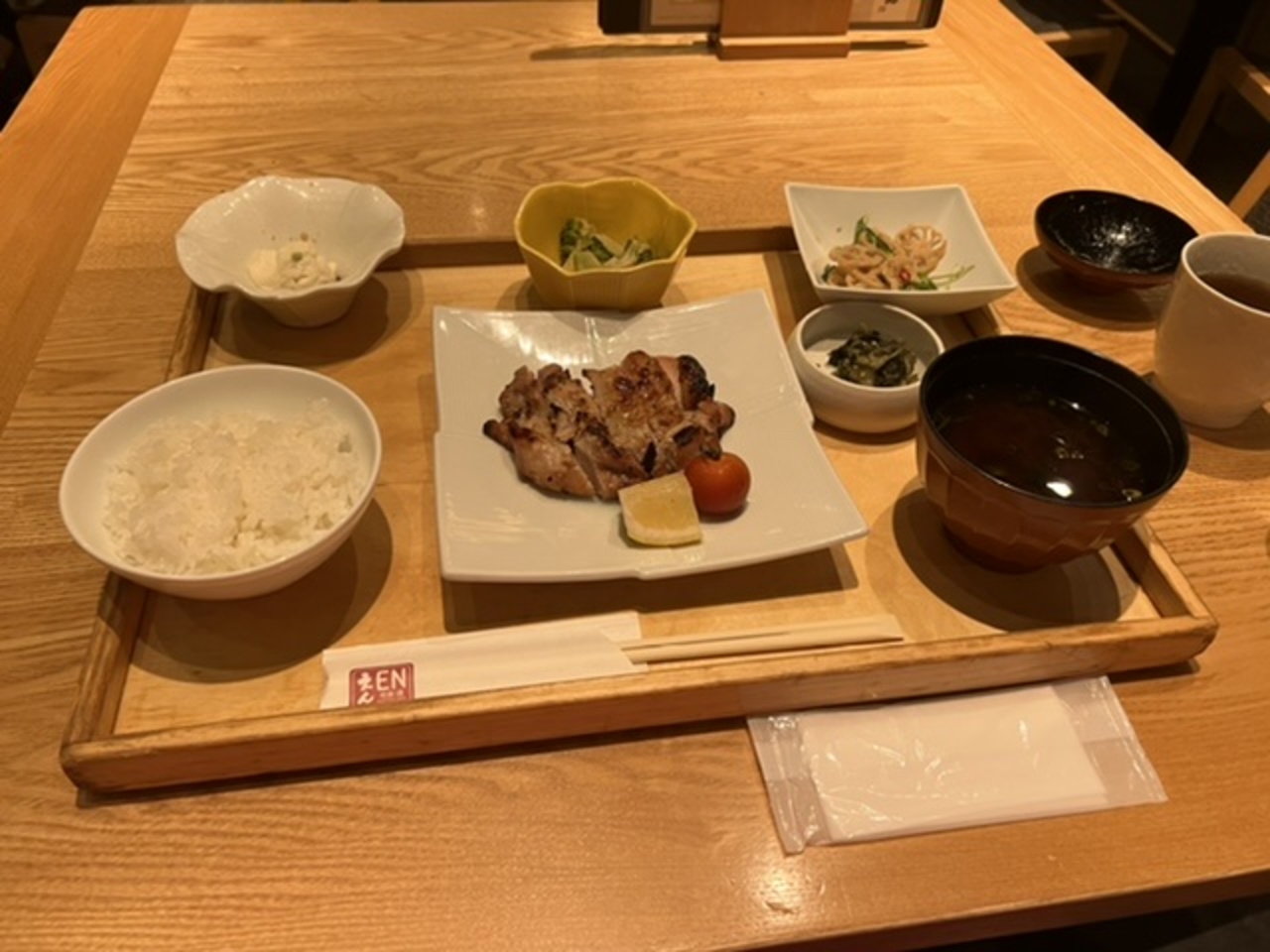 食べたのは本日のお薦め肉料理!鶏の塩麹レモン焼きでした。おばんざい3種と漬物、赤だしが付いてご飯のおかわりはできます。美味しいですよここは。