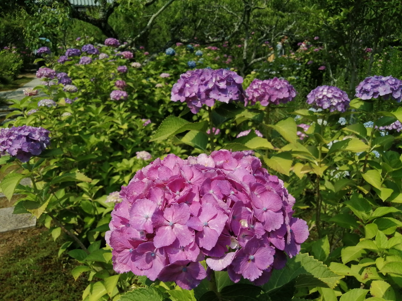 今年は6/17に紫陽花を見に行きました。平日にも関わらず見頃な時期のためか駐車場に入るための順番待ちができていました(私はチャリなので関係なし)。駐車場料金は無料ですが任意の協力金(お布施?)300円を入れる箱が用意されています。その数1万本とも言われるだけあり、見ごたえはあります。しかし山門前の“紫陽花の回廊”は昨年に比べやや寂しい感じ。この日は午後から日が出てかなりの暑さ。日に当たっている紫陽花は萎れ気味でした。紫陽花を楽しむなら小雨程度の方が楽しめると思います。