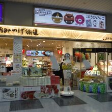 新幹線の改札を入った構内にあります。あまり広くはありませんが、お土産にしたい岡山の銘菓や果物などを全面に押し出しています。荷物になるのでこちらで乗車前に購入も良いと思います。岡山の美味しい桃やマスカットの発送もありました。