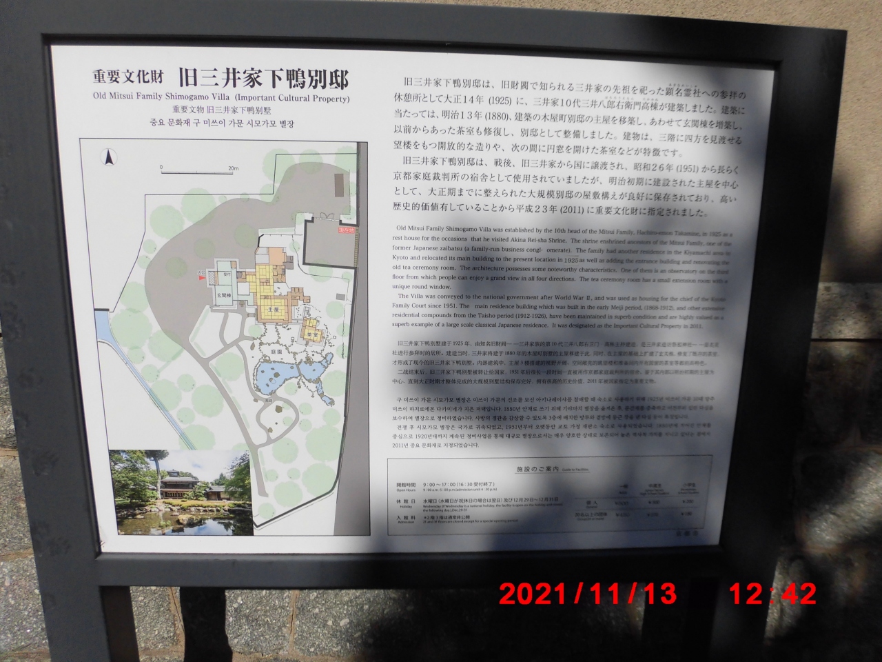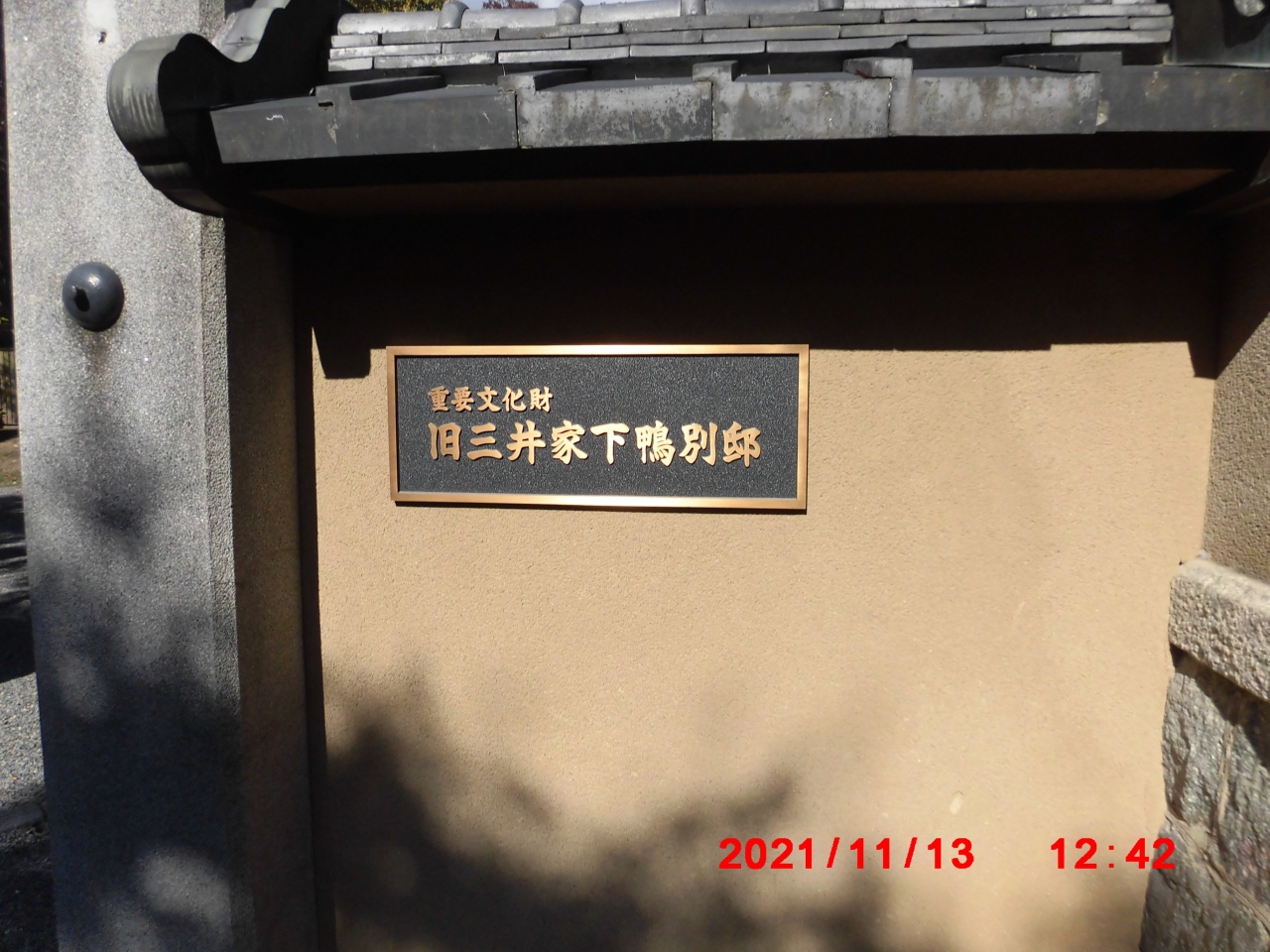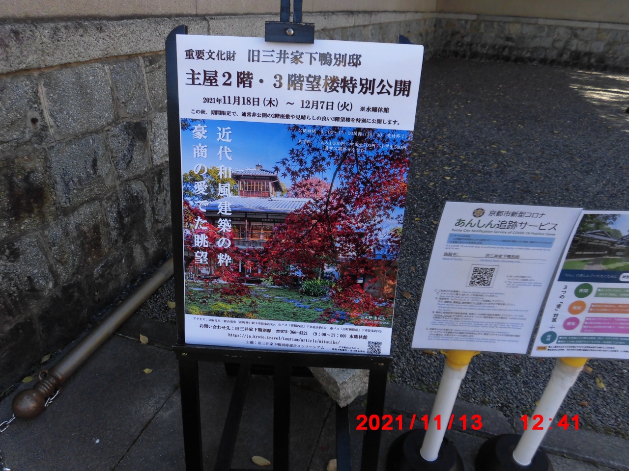 京都市観光で立ち寄りました。旧三井家下鴨別邸は、豪商・三井家の旧別邸を公開している建物で、下鴨神社(賀茂御祖神社)の一之鳥居の近くを歩いている時に見つけました。三井家の祖霊社の参拝の際の休憩所として建てられたというのですからすごい大きなスケールの話です。11月18日から2階と3階のを特別公開と言うことでしたが、残念ながら5日も先の話なので外観だけ楽しんできました。