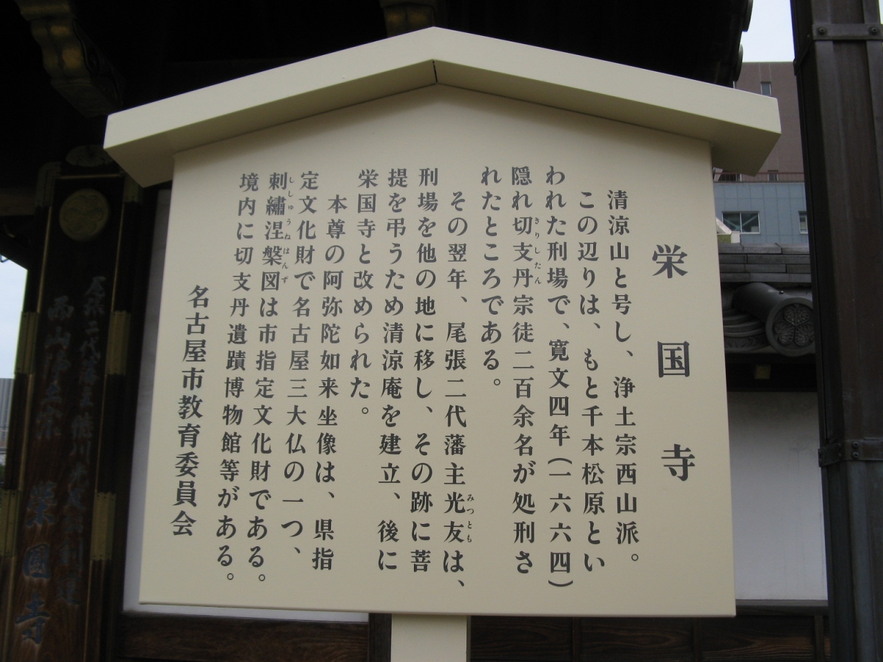 現地にあった由緒書き(添付写真)によると、この辺りは千本松原と言われた刑場で、寛永四年(1664年)隠れ切支丹200余名が処刑され、その翌年尾張二代藩主光友が、刑場を他の地に移して、その跡に菩提を弔うために清涼庵を建立して、後に栄国寺と改められとか。山門を潜った先に幼稚園があり、お寺は左手奥にあります。境内は狭いですが、立派な本堂や佛足石、昔のお堂の鬼瓦、切支丹塚、切支丹の墓石など珍しいものがありました。キリシタン遺跡博物館も見所の一つです。