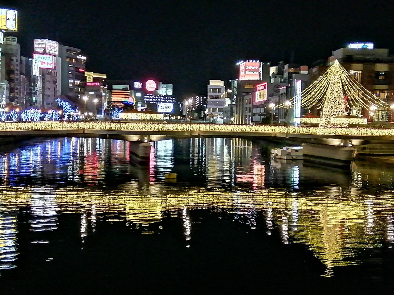 クリスマス前だったので、福博であい橋のツリーも加わってさらにきれいでした。