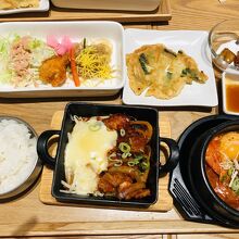 チヂミとから揚げ、チャプチェ、サラダ、デザート付きです。